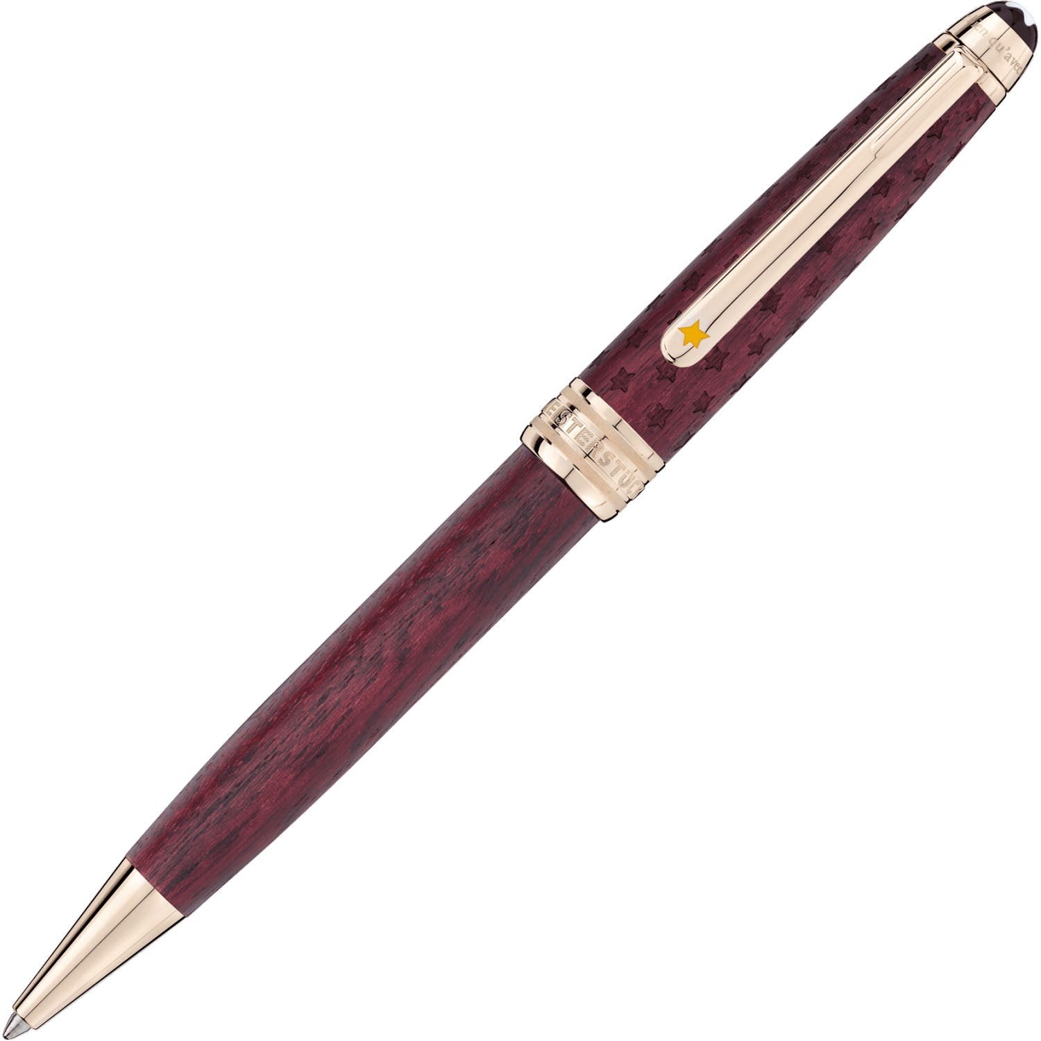 La penna a sfera Meisterstück Le Petit Prince Solitaire media con cappuccio in legno bordeaux è legata all’estetica delle stelle. I tre anelli finitura platino recano il logo Montblanc, mentre la clip è impreziosita da una stella gialla laccata.