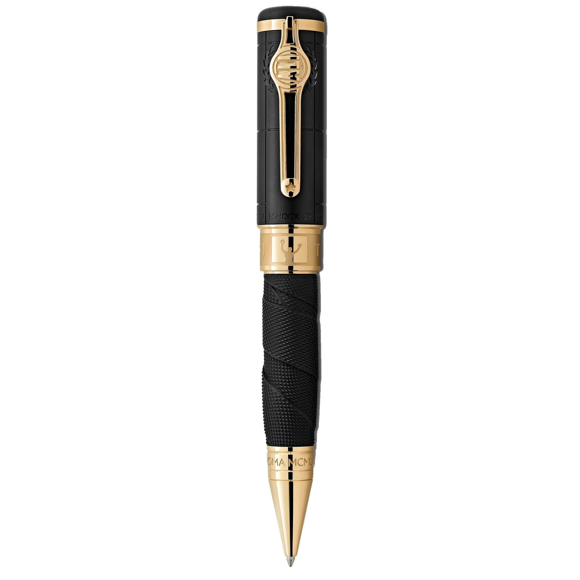 Solo pochi atleti vengono celebrati e onorati come Muhammad Ali, tre volte Campione del Mondo dei Pesi Massimi: le sue leggendarie gesta nel mondo dello sport e dell’attivismo per i diritti civili lo hanno reso uno degli atleti e degli operatori umanitari più influenti del XX secolo. Come atleta, Ali ha scosso il mondo intero con la sua forza, le sue capacità e la sua personalità, diventando Campione del Mondo dei Pesi Massimi all’età di soli 22 anni. I suoi più grandi trionfi, tuttavia, sono stati frutto del suo impegno umanitario. Realizzato in pregiata resina nera, il cappuccio riproduce la forma di un sacco da boxe, mentre il design del corpo ricrea le fasce da boxe indossate dai pugili per proteggere le mani. Il cappuccio presenta vari elementi decorativi, fra cui una celebre esclamazione di Ali, e una farfalla ispirata al suo tipico stile di combattimento: Volteggia come una farfalla, pungi come un’ape . Il cono a punta riprende proprio quest’ultimo concetto e reca incise quattro linee che rappresentano le corde del ring. Le iscrizioni sulla punta della penna a sfera si riferiscono alla vitoria di Ali ai Giochi Olimpici di Roma del 1960, e al primo campionato mondiale dei pesi massimi, che vinse a Miami nel 1964. L’anello del cappuccio presenta i dettagli della sua vittoria, ovvero il fatto di aver vinto al settimo round per KO tecnico. Per celebrare il suo primo titolo, l’emblema Montblanc in resina bianca è ornato dal numero 1 . Per enfatizzare il suo successo, la clip riproduce la forma di una cintura da campione di boxe con il suo nome.