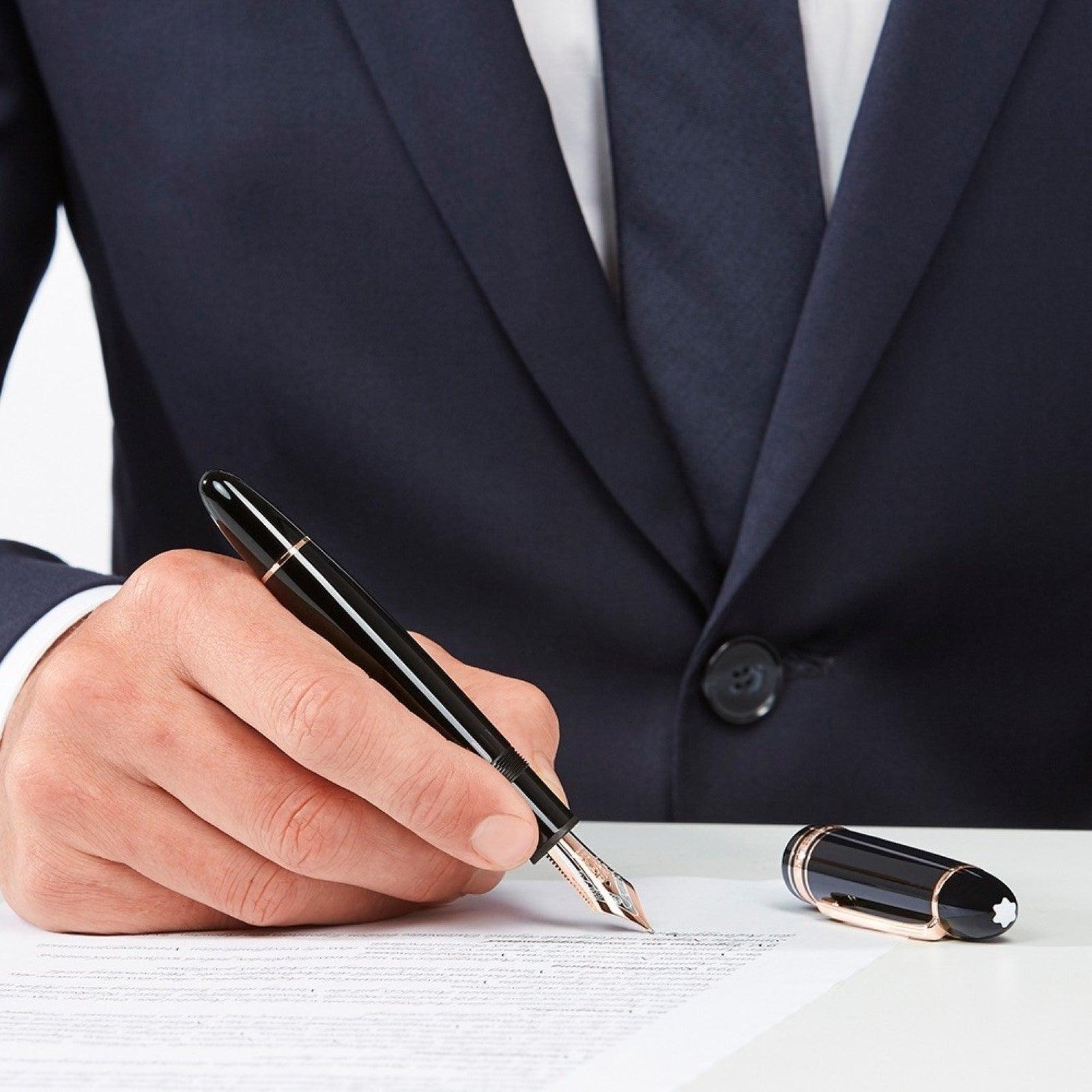 Montblanc Meisterstück 149 The Meisterstück Rose Gold-coated collection features a design that has made history. Introduced in 1924 with a name meaning "masterpiece," the Meisterstück has become a symbol of luxury writing. The barrel and cap are crafted from black precious resin, inlaid with the iconic Montblanc emblem in white on the cap. The fountain pen is enhanced by a handcrafted 14K solid gold nib with a two-tone rhodium and rose gold plating.