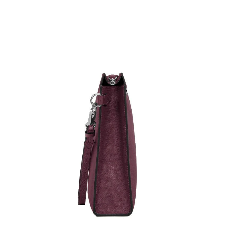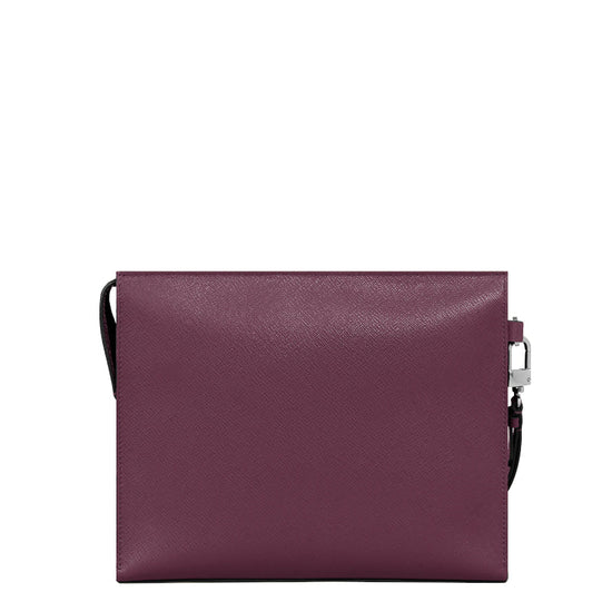 Conserva i tuoi oggetti essenziali quotidiani in una raffinata pochette sartoriale. Realizzata in elegante pelle stampata Saffiano color cassis, lo scomparto principale della pochette è dotato di un'ulteriore tasca aperta per una maggiore praticità. Può essere tenuto in mano, indossato sotto il braccio o avvolto attorno al polso grazie al manico staccabile.