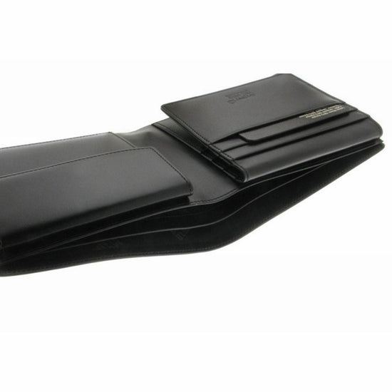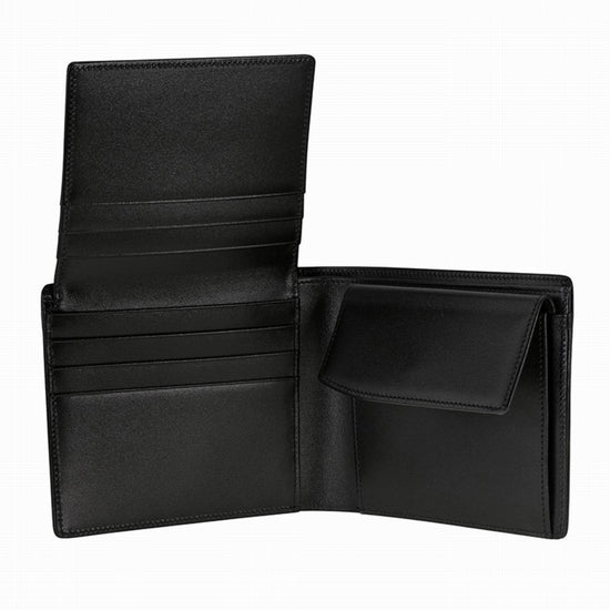 Portafoglio in pelle di vitello pieno fiore europea, nero lucido esclusivo Montblanc, fodera jacquard con marchio Montblanc, emblema Montblanc con anello finitura palladio, 10 tasche per carte di credito, 2 scomparti per banconote, portamonete con patta
