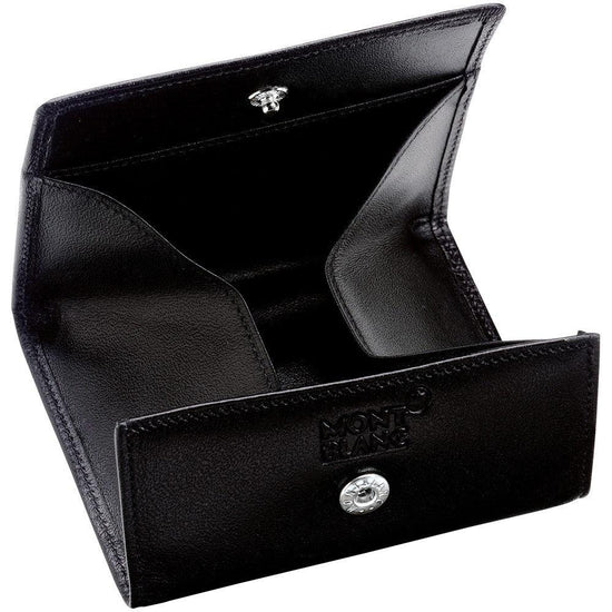 Portamonete piccolo con chiusura a pressione in vitello pieno fiore europeo, nero lucido esclusivo Montblanc, emblema Montblanc con anello finitura palladio.