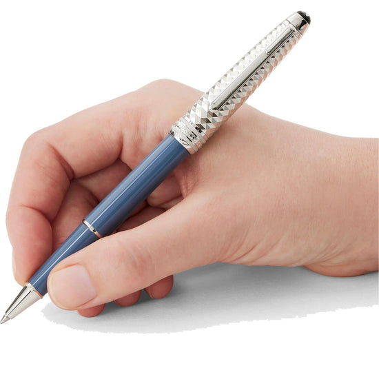 Il roller Meisterstück Glacier Doué, caratterizzato da una pregiata resina blu, si ispira ai ghiacciai del Monte Bianco, simbolo della nostra dedizione alla qualità superiore e del nostro slancio verso l’esplorazione e lo spirito d’avventura. Il cappuccio in metallo finitura platino decorato da un’incisione dal motivo esclusivo rievoca le rifrazioni dei cristalli di ghiaccio.