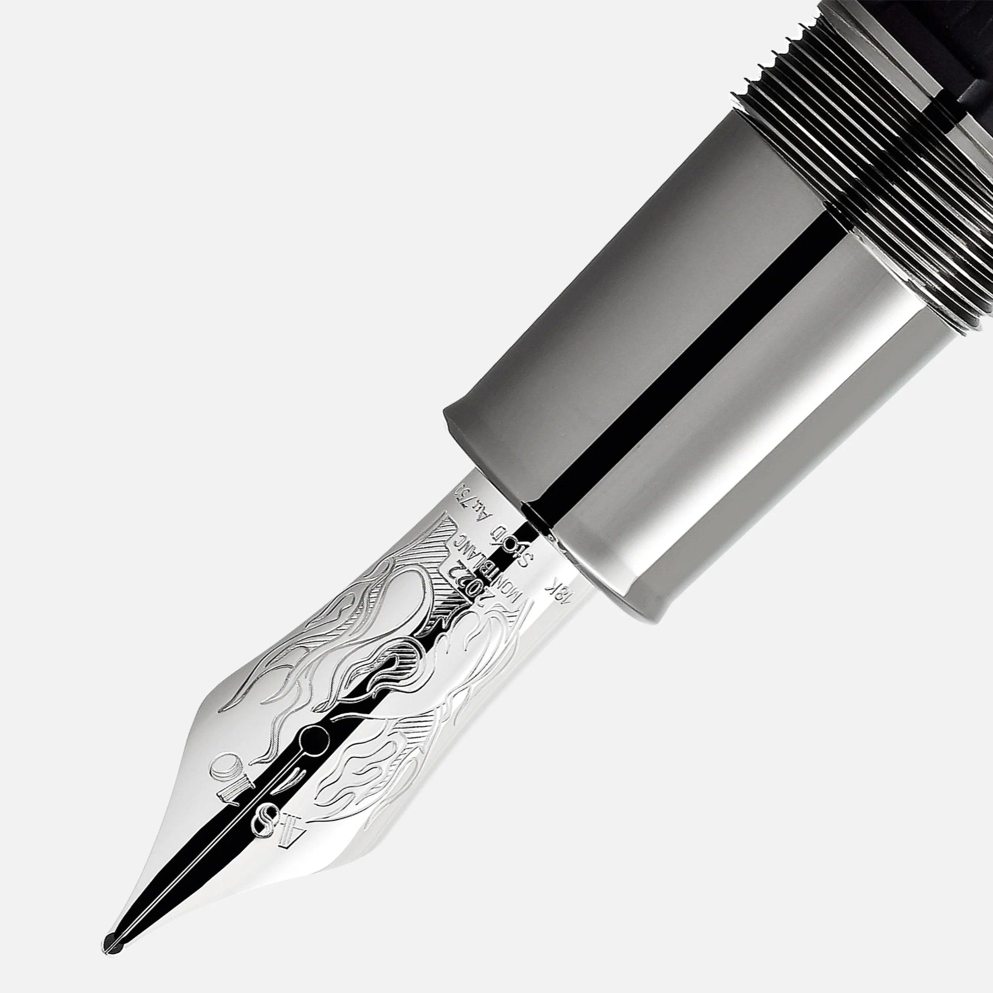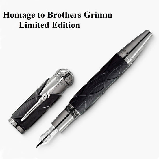 "C'era una volta..." Il Montblanc Writers Edition Homage to the Brothers Grimm è dedicato a Jacob e Wilhelm Grimm e celebra il loro lavoro sui racconti popolari tedeschi ed europei, tra cui alcune delle fiabe più famose come "Biancaneve", "Cenerentola" e "Sleeping Beauty". La silhouette generale dello strumento da scrittura ha la forma di un vecchio bastone da trekking, mentre il colore nero assomiglia all'oscurità dei boschi che di solito fungono da palcoscenico principale per il folklore dei Fratelli Grimm. Inoltre, il motivo ondulato sul berretto e sulla canna si ispira ai capelli di Rapunzel mentre assomiglia anche alle radici, poiché i fratelli Grimm vedevano il loro lavoro linguistico come "ricerca sulle radici". Il berretto è incoronato dall'emblema Montblanc in resina preziosa. La clip rivestita in platino, che ricorda un pezzo di legno, rivela sorprendentemente la silhouette del profilo dei fratelli Grimm quando viene girata.
