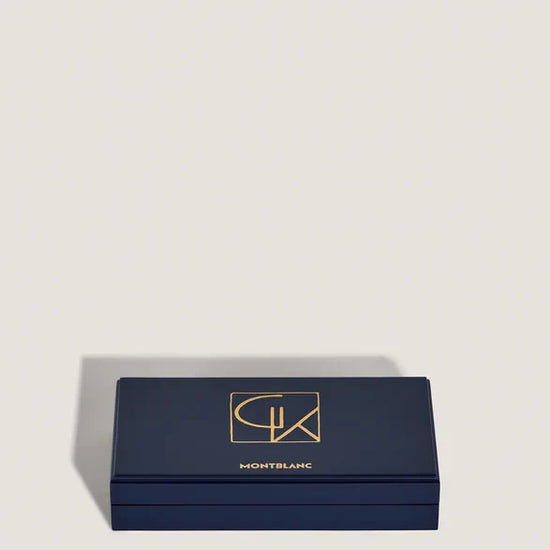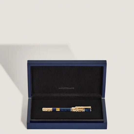 Questa stilografica Montblanc Masters of Art è un omaggio al famoso artista Gustav Klimt e alle sue opere del "periodo aureo". Le decorazioni di cerchi, spirali, triangoli e linee sono ispirate al celebre dipinto "Il bacio". La lacca blu traslucida e il metallo martellato finitura oro giallo si combinano perfettamente, offrendo un omaggio elegante e raffinato alle celebri opere di Klimt.