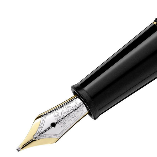 La stilografica Meisterstück Gold-Coated Classique diventa un’icona del design Montblanc. Il corpo e il cappuccio sono in pregiata resina nera con emblema Montblanc bianco intarsiato. I tre anelli finitura oro con goffratura del marchio Montblanc e la clip finitura oro con numero di serie individuale mettono ulteriormente in risalto il design intramontabile della stilografica Meisterstück Classique. Questa stilografica finitura oro presenta un sistema con converter a stantuffo, che consente l’uso facoltativo di inchiostro in cartucce, e un pennino in oro 14 K lavorato a mano con inserto finitura rodio. Per esprimere la vostra personalità, Montblanc offre l’incisione gratuita di nomi o iniziali.