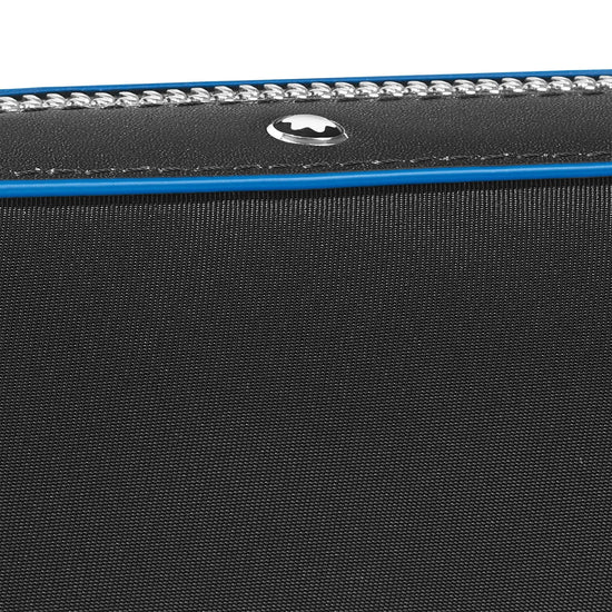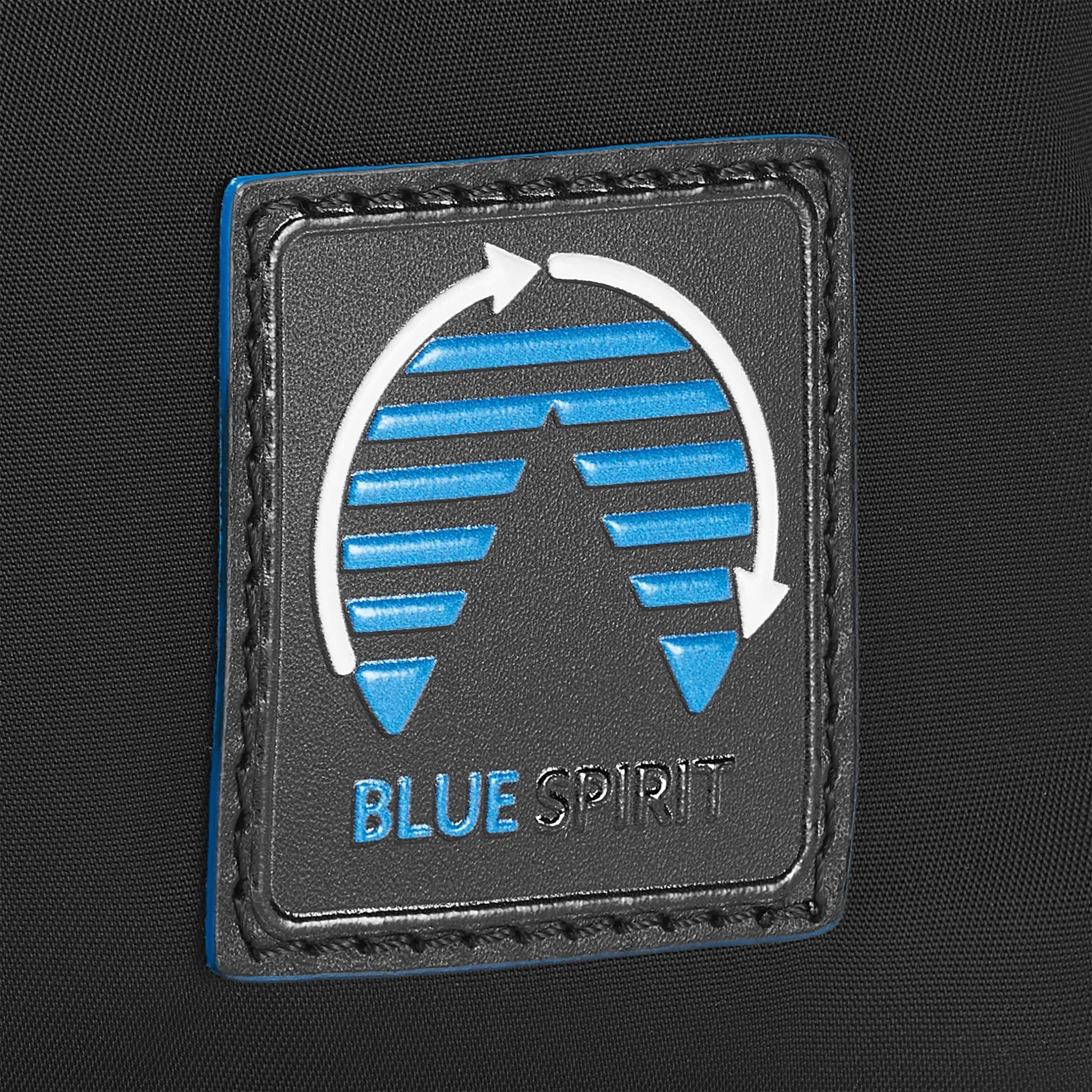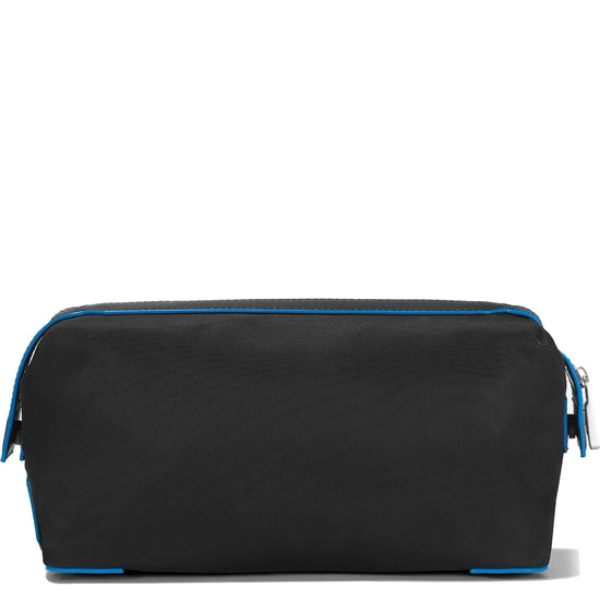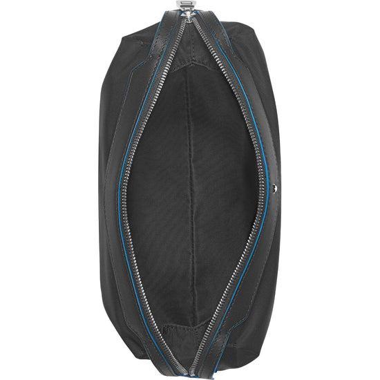 La trousse da toilette è stata realizzata principalmente con materiali rispettosi dell'ambiente. Il tessuto è realizzato in ECONYL®, un filato di nylon sostenibile proveniente da rifiuti rigenerati, che può essere riciclato e ricreato. Il raffinato rivestimento in pelle nera con bordi blu è prodotto tramite un processo di concia CO2 neutro. Tutte queste scelte riducono l'impronta ambientale rispetto ai materiali e alle lavorazioni tradizionali, rendendo questo un prodotto ecosostenibile. All'esterno della borsa è applicata una patch che richiama l'ecosostenibilità della linea.