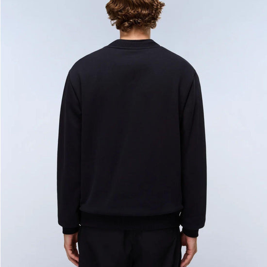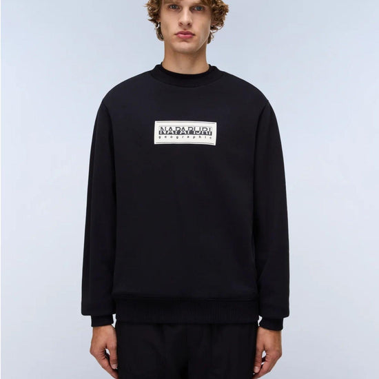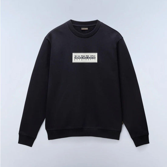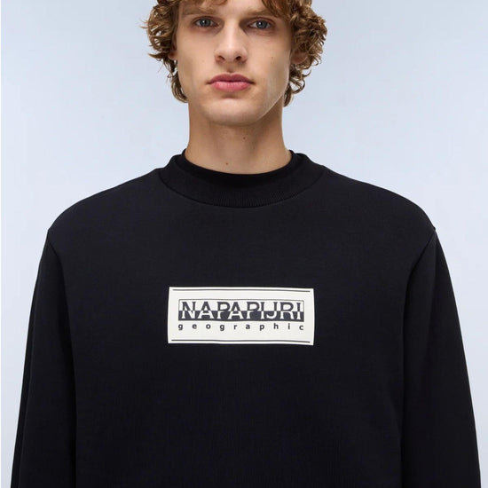 Modern black cotton crewneck sweatshirt with a raised silicone Box Logo print and contrasting background for a distinctive, contemporary urban style. Crafted from soft cotton with a cut-and-sew design, it features a ribbed collar, cuffs, and hem for superior comfort. The relaxed fit offers volume and softness on the body, ensuring a comfortable and contemporary fit. Ideal for casual looks with a bold personality. 90% cotton, 10% polyester.
