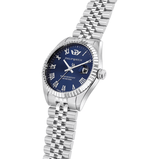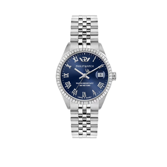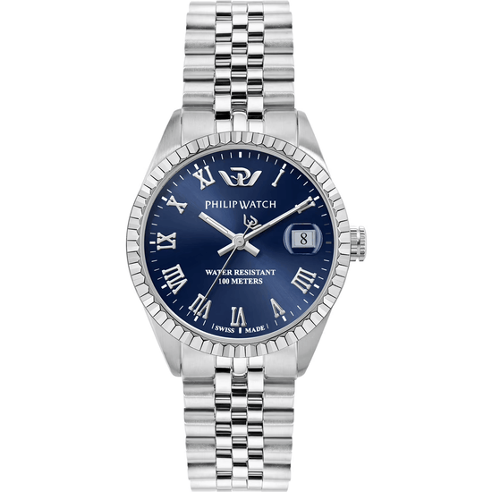 Il Philip Watch Caribe è l'orologio ideale per la donna che cerca un perfetto equilibrio tra eleganza e funzionalità. Con la sua cassa in acciaio lucido e satinato da 35 mm, questo orologio esprime raffinatezza e solidità. Il vetro zaffiro, con trattamento antiriflesso, assicura resistenza ai graffi e massima visibilità, mentre il cinturino in metallo silver, con fibbia diver e blocco di sicurezza, offre un comfort senza pari. Dotato di movimento Swiss Made, è perfetto per ogni occasione.