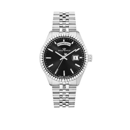 Un perfetto connubio tra raffinatezza e funzionalità. Il Philip Watch Caribe R8253597067 si distingue per il suo design classico e la precisione del movimento al quarzo Swiss Made. La cassa in acciaio da 39 mm, con finitura lucida, dona un tocco di eleganza, mentre il quadrante nero crea un contrasto sofisticato con gli indici e le lancette luminose. La funzione Day-Date, posizionata a ore 3, aggiunge praticità quotidiana, rendendolo un segnatempo versatile per ogni occasione.