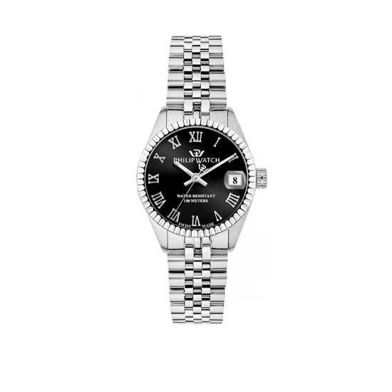 Un connubio perfetto tra raffinatezza e praticità. Il Philip Watch Caribe R82 si distingue per la sua cassa rettangolare in acciaio satinato (39x31.3 mm) dal sofisticato colore nero, che conferisce un tocco di eleganza moderna. Il quadrante, protetto da vetro zaffiro, offre un'ottima leggibilità e resistenza, mentre il bracciale in metallo argentato assicura comfort e stile in ogni occasione.