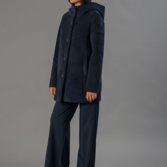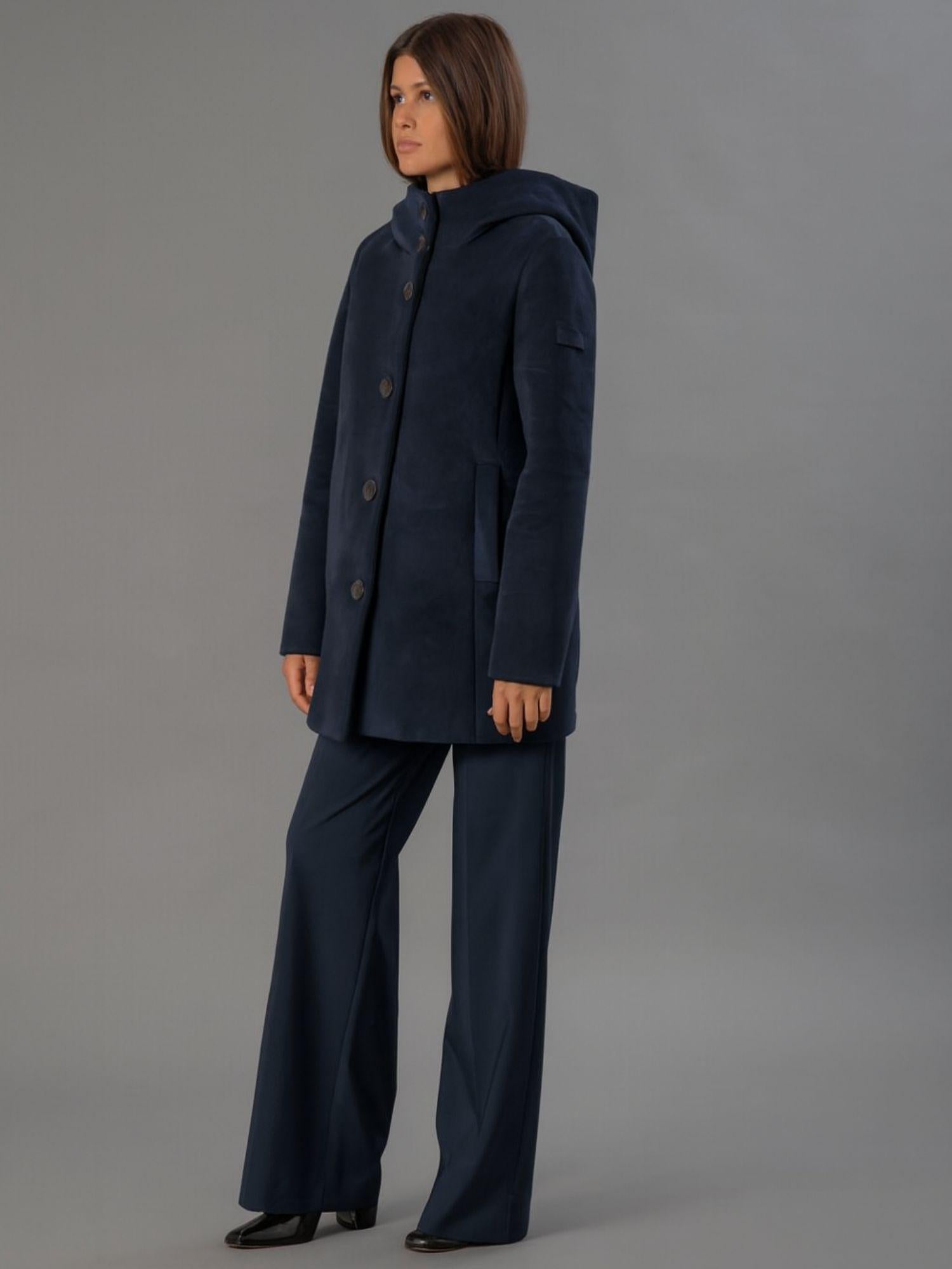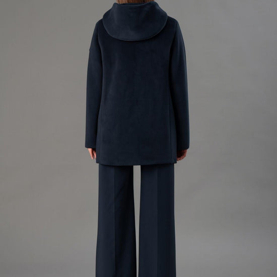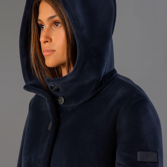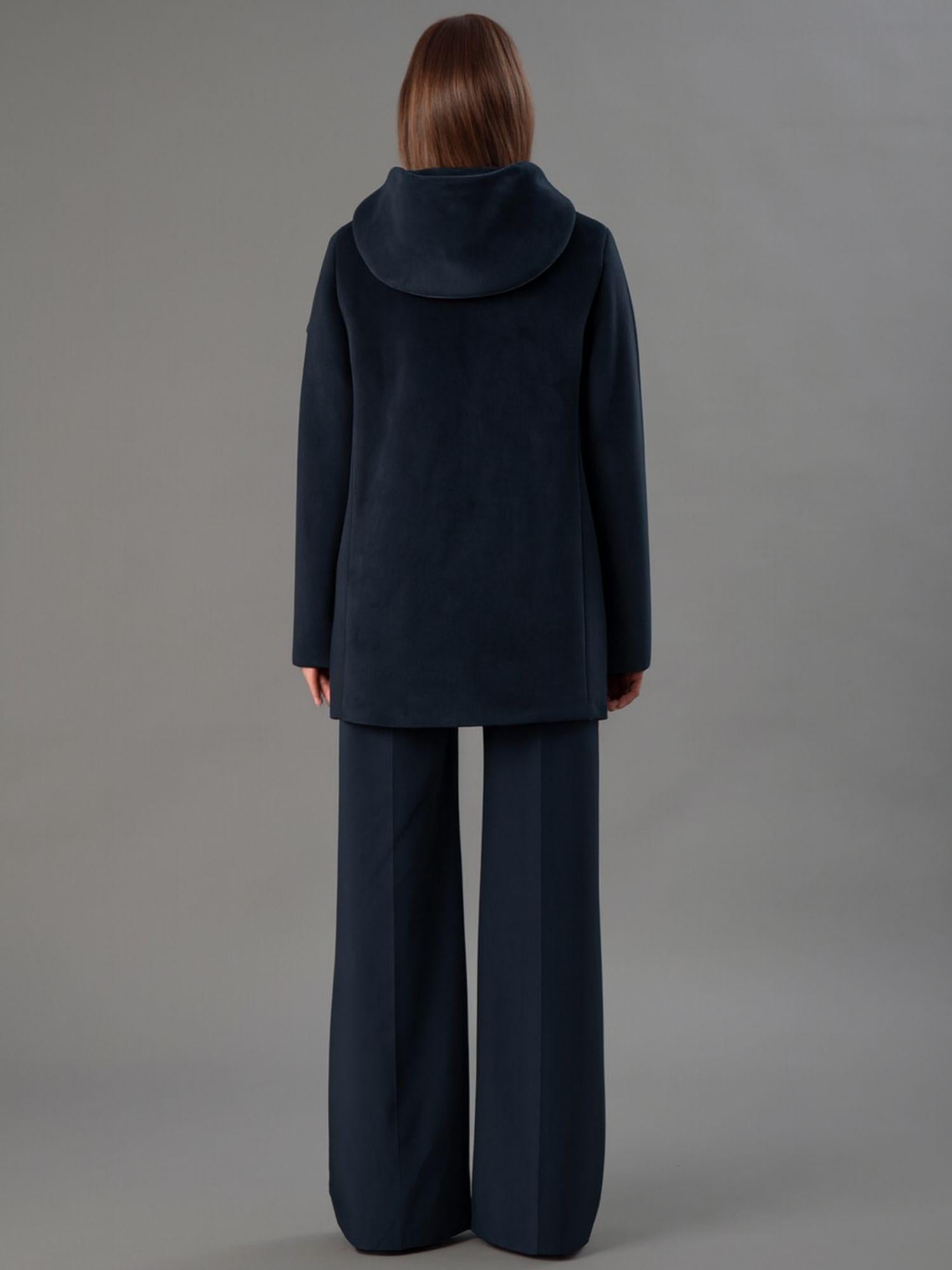 Smooth stretch velvet outerwear bonded to black jersey, featuring a soft and refined texture that combines comfort and style. The enveloping hood and flat, stitched logo buttons add an elegant, contemporary touch, while welt pockets complete the design with discreet functionality. The regular fit and mid-length flatter the silhouette, making it perfect for sophisticated and versatile looks. Fabric: 95% polyester, 5% elastane.