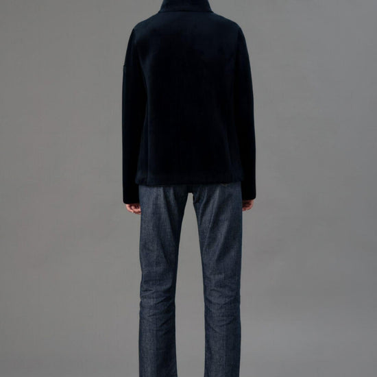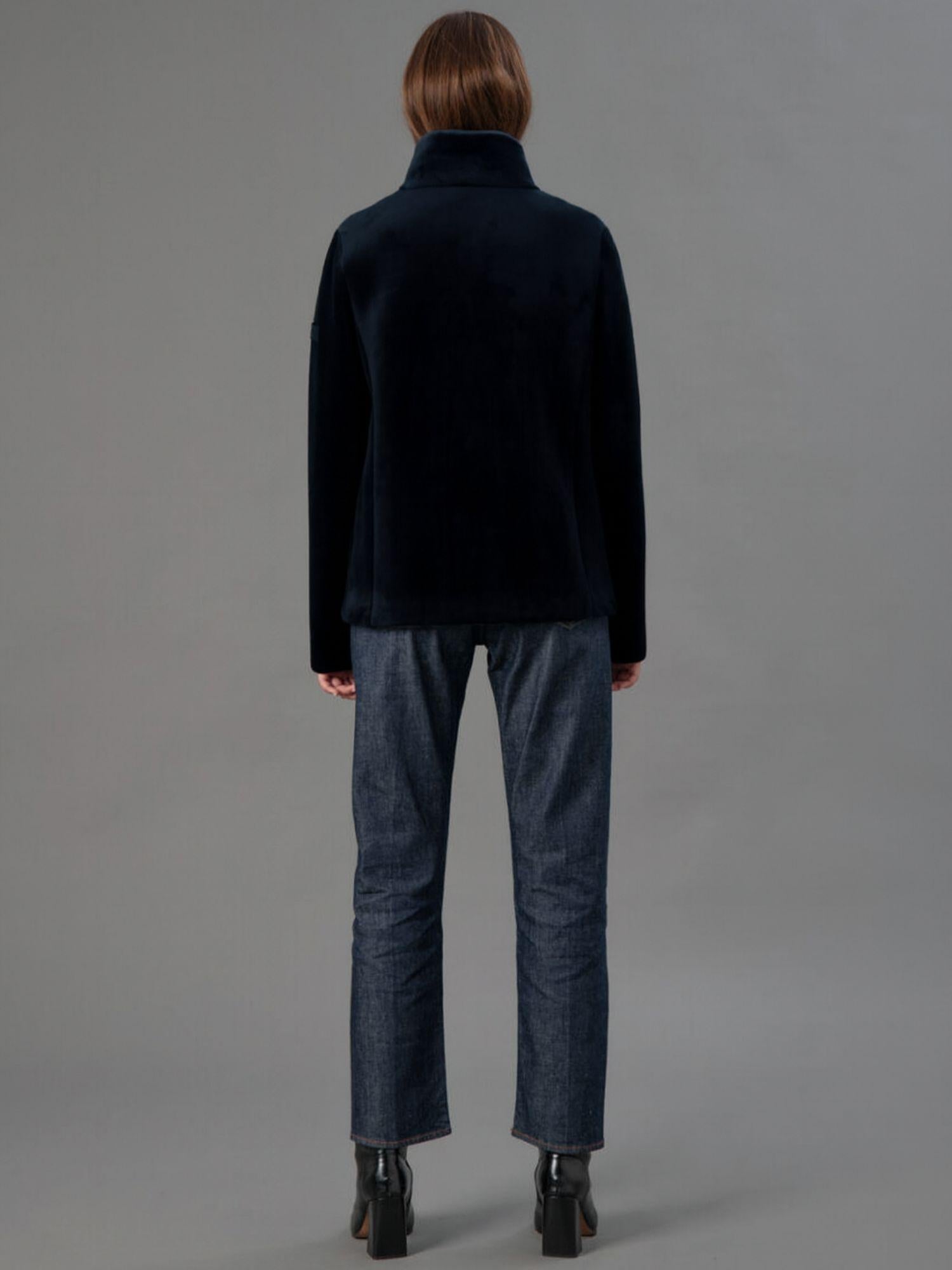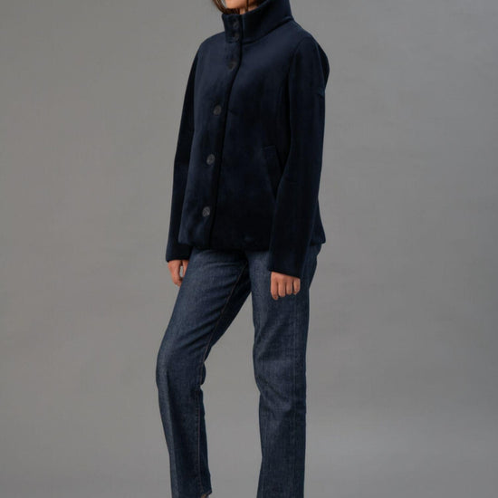 Giubbino corto realizzato in velluto liscio stretch accoppiato a jersey nero, pensato per offrire un perfetto equilibrio tra eleganza e comfort. Il collo alto e i bottoni piatti logati cuciti a filo donano un tocco sofisticato, mentre le tasche a filetto aggiungono praticità e stile. La vestibilità regular valorizza la silhouette senza rinunciare alla comodità, rendendolo ideale per completare look moderni e raffinati. Tessuto: 95% poliestere, 5% elastan.