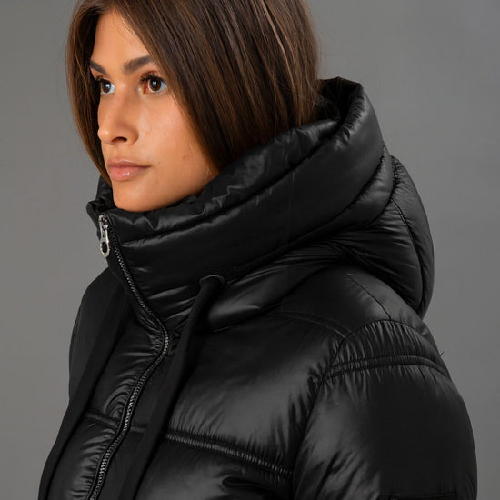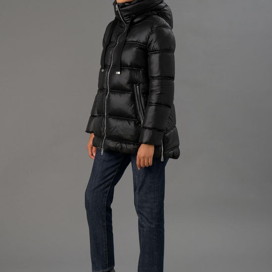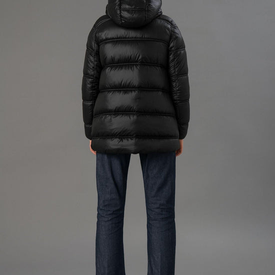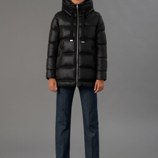 Capospalla imbottito realizzato in nylon leggero con trama nera dalleffetto cangiante, ideale per un look moderno e funzionale. Il cappuccio avvolgente con doppio orlo offre protezione e stile, mentre le tasche laterali a doppio filetto imbottito con zip e le aperture laterali con zip aggiungono praticità e carattere. La trapuntatura a doppio ago e limbottitura media garantiscono calore e comfort, mentre la linea svasata di media lunghezza assicura una vestibilità femminile e regolare. Tessuto: 100% nylon.