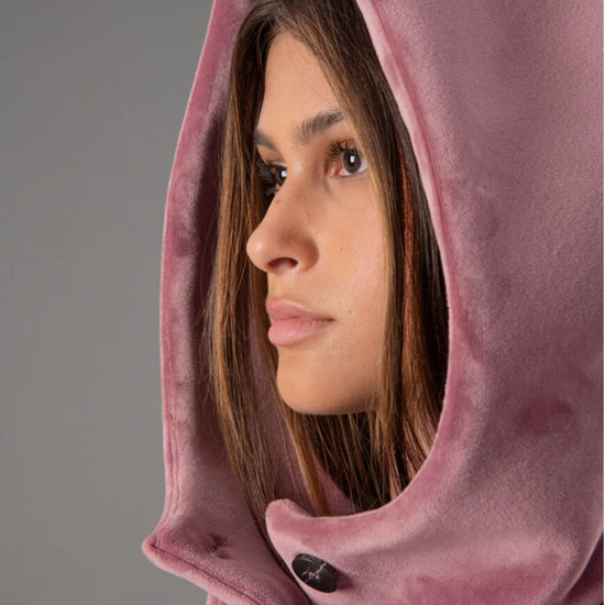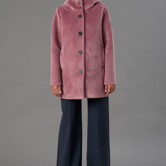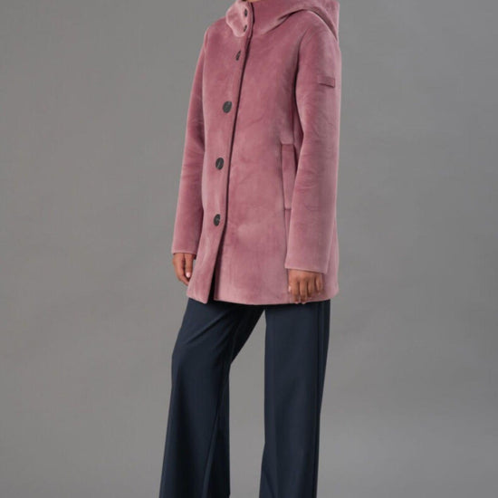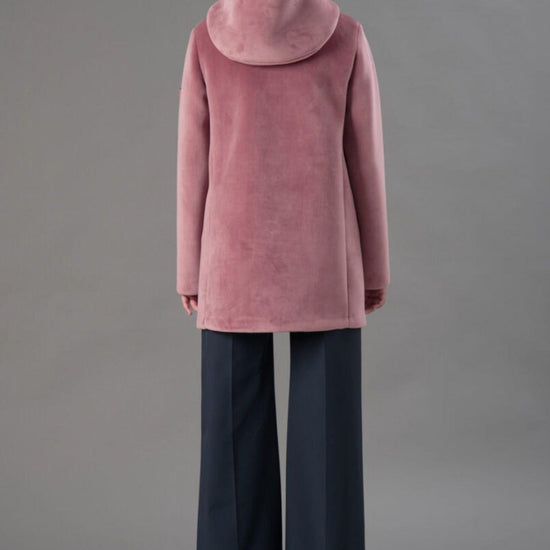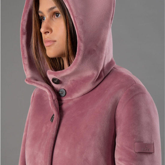 Smooth stretch velvet outerwear bonded to black jersey, featuring a soft and refined texture that combines comfort and style. The enveloping hood and flat, stitched logo buttons add an elegant, contemporary touch, while welt pockets complete the design with discreet functionality. The regular fit and mid-length flatter the silhouette, making it perfect for sophisticated and versatile looks. Fabric: 95% polyester, 5% elastane.