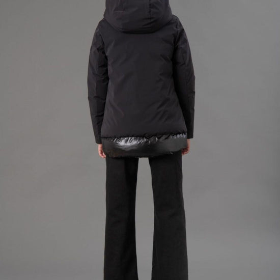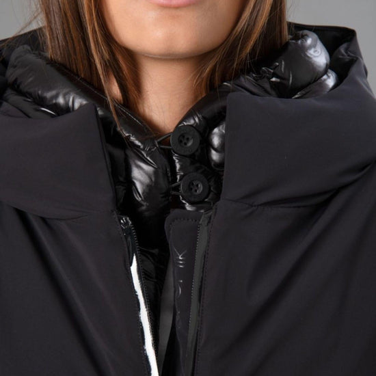 Smooth jacket with a casual design made of matte stretch nylon with ultra-lightweight shiny nylon details, perfect for a modern and functional look. The enveloping hood with integrated collar and water-repellent zips on the front closure and pockets ensure protection and practicality. The ribbed cuffs and rounded back, longer than the front, add comfort and style. Regular fit with an A-line silhouette, ideal for any occasion. Fabric: 90% nylon, 10% elastane.