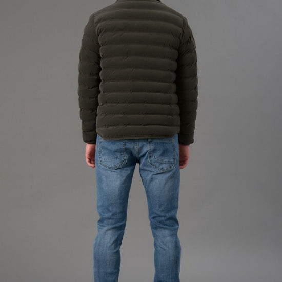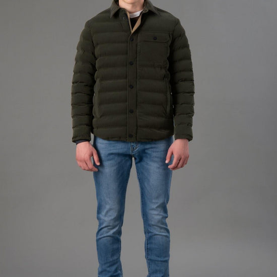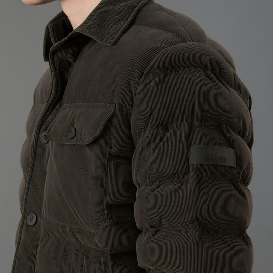 A timeless shacket with a casual, contemporary feel, crafted from black finely ribbed and bonded velvet. It features heat-sealed quilting, side welt pockets in compact, heat-sealed matte technical nylon, and a heart-shaped patch pocket with a flap. The shirt collar and lower pocket with a tonal silicone-effect print complete the design. Regular fit, perfect for a relaxed yet refined look. Fabric: 100% nylon.