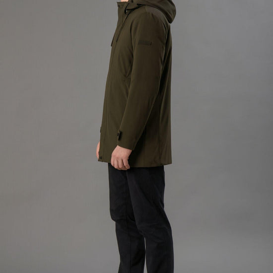 Smooth outerwear with a modern and casual design, made of bonded matte stretch nylon for comfort and freedom of movement. It features heat-sealed black eyelets, a hood with a tonal silicone-effect print, and side zip pockets with waterproof tape. The regular fit and mid-length make it perfect for a functional, urban look. Fabric: 88% nylon, 12% elastane.