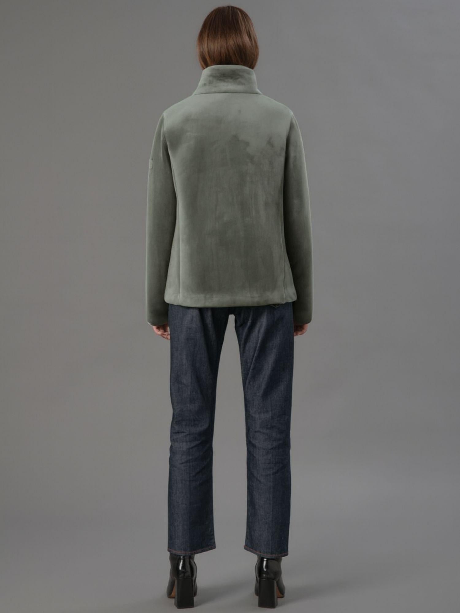 Giubbino corto realizzato in velluto liscio stretch accoppiato a jersey nero, pensato per offrire un perfetto equilibrio tra eleganza e comfort. Il collo alto e i bottoni piatti logati cuciti a filo donano un tocco sofisticato, mentre le tasche a filetto aggiungono praticità e stile. La vestibilità regular valorizza la silhouette senza rinunciare alla comodità, rendendolo ideale per completare look moderni e raffinati. Tessuto: 95% poliestere, 5% elastan.
