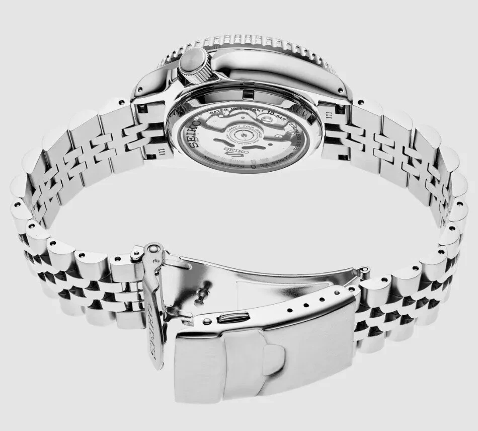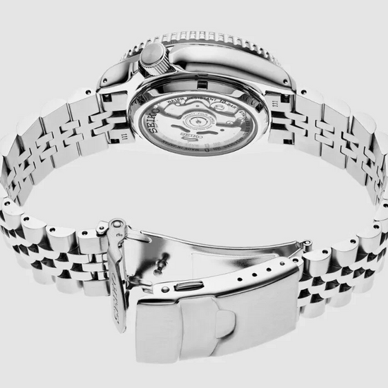 A modern icon that combines sporty style and travel functionality. The Seiko SSK001 features a bold design with a black dial and two-tone bezel, ideal for those looking for a reliable automatic watch with a GMT function. The 42.5 mm stainless steel case and integrated bracelet complete a robust and contemporary look.