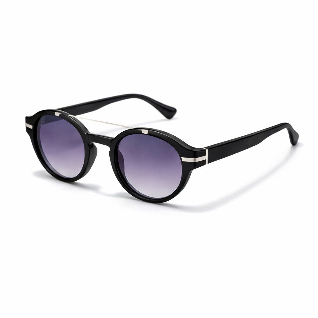 Il frontale nero lucido, con il suo doppio ponte, aggiunge un tocco contemporaneo a una forma rotonda senza tempo. Le aste nere lucide completano il design con armonia, mentre il tlogo grigio si inserisce con discrezione ma raffinatezza.