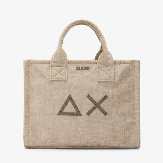 Handles, removable grosgrain shoulder strap, internal logo label, internal pocket, SUN68 lurex logo patch on the front, zip closure. 100% Polyester