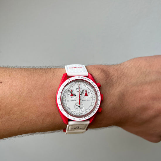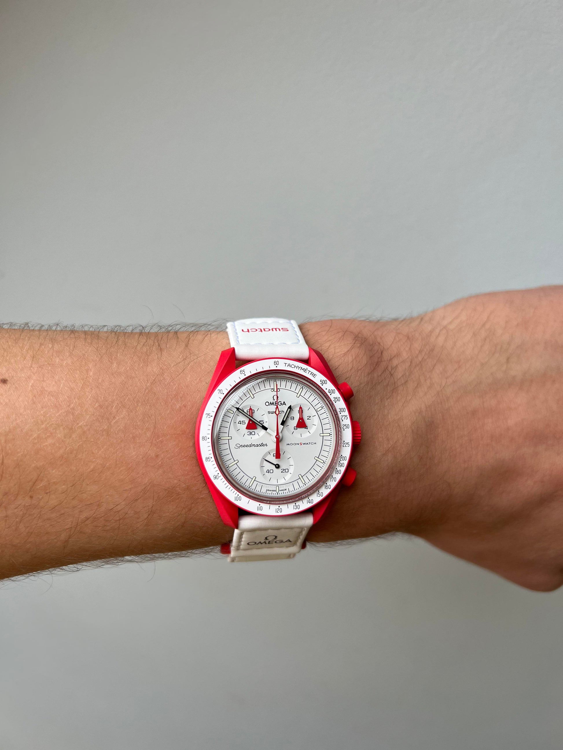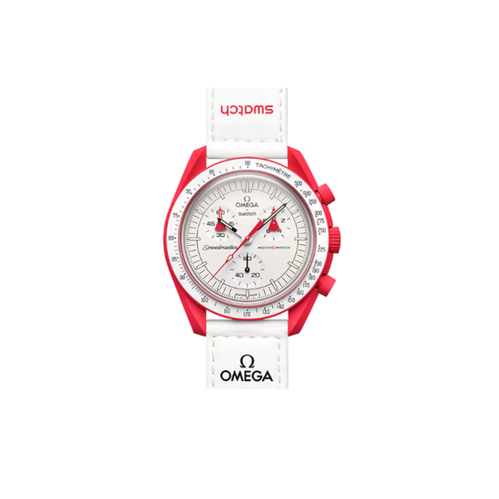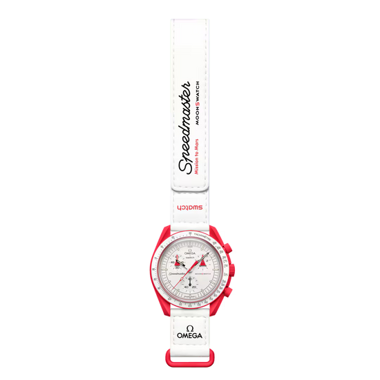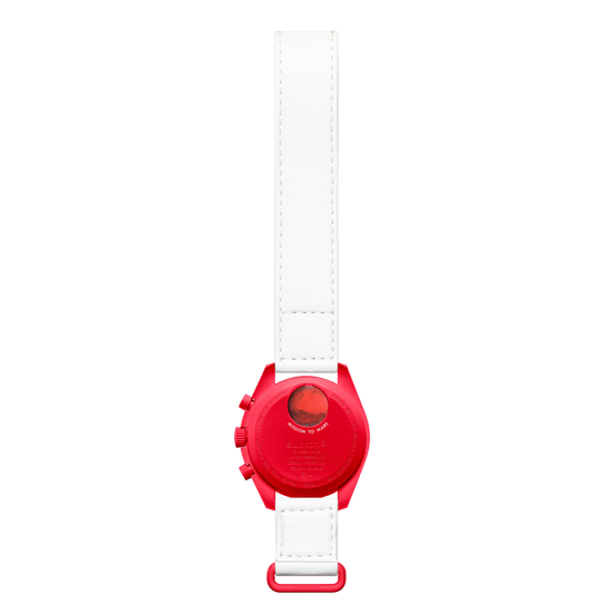 Il MoonSwatch Mission to Mars celebra l’esplorazione spaziale con un design audace e immediatamente riconoscibile. La cassa in Bioceramic rossa e i contatori bianchi richiamano la superficie del pianeta rosso, creando un orologio dal forte impatto visivo e dallo spirito pionieristico.