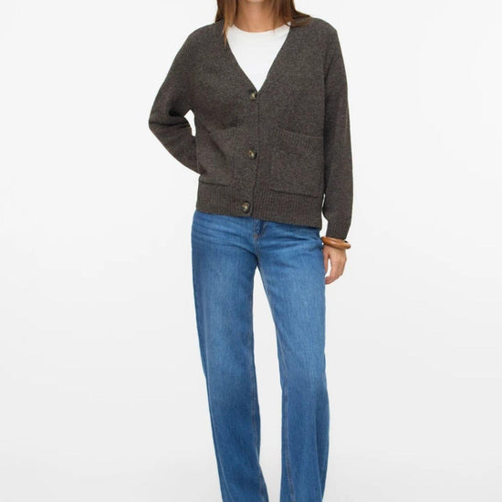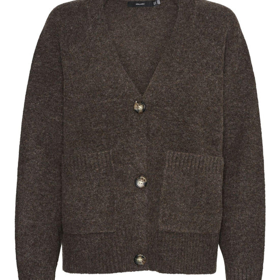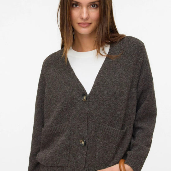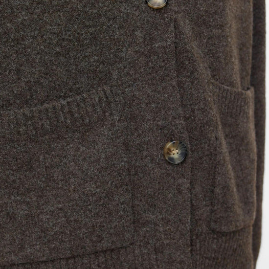 This heavyweight knit cardigan features a cozy and versatile design, ideal as an extra layer to add warmth and style to any outfit. It features a V-neck, long sleeves, ribbed cuffs, a button closure, and practical front pockets. The loose fit ensures comfort and freedom of movement, perfect for wearing as a knit jacket or over elegant looks for a touch of softness and sophistication. Composition: 53% recycled polyester, 32% polyester, 7% acrylic, 5% RWS, 3% elastane.