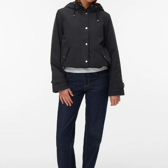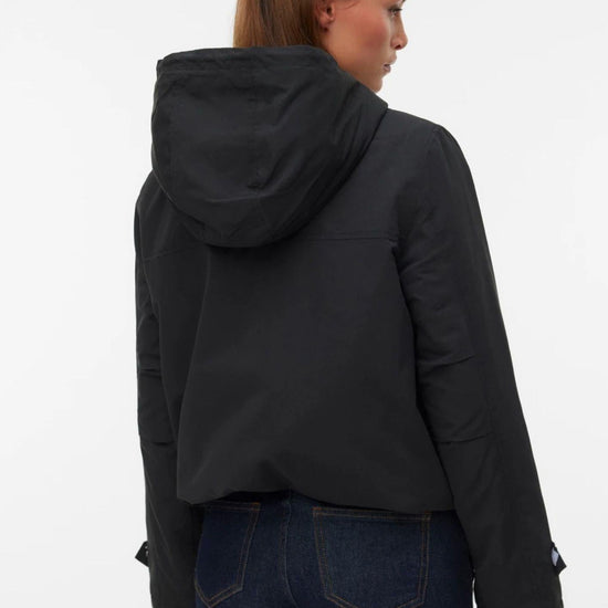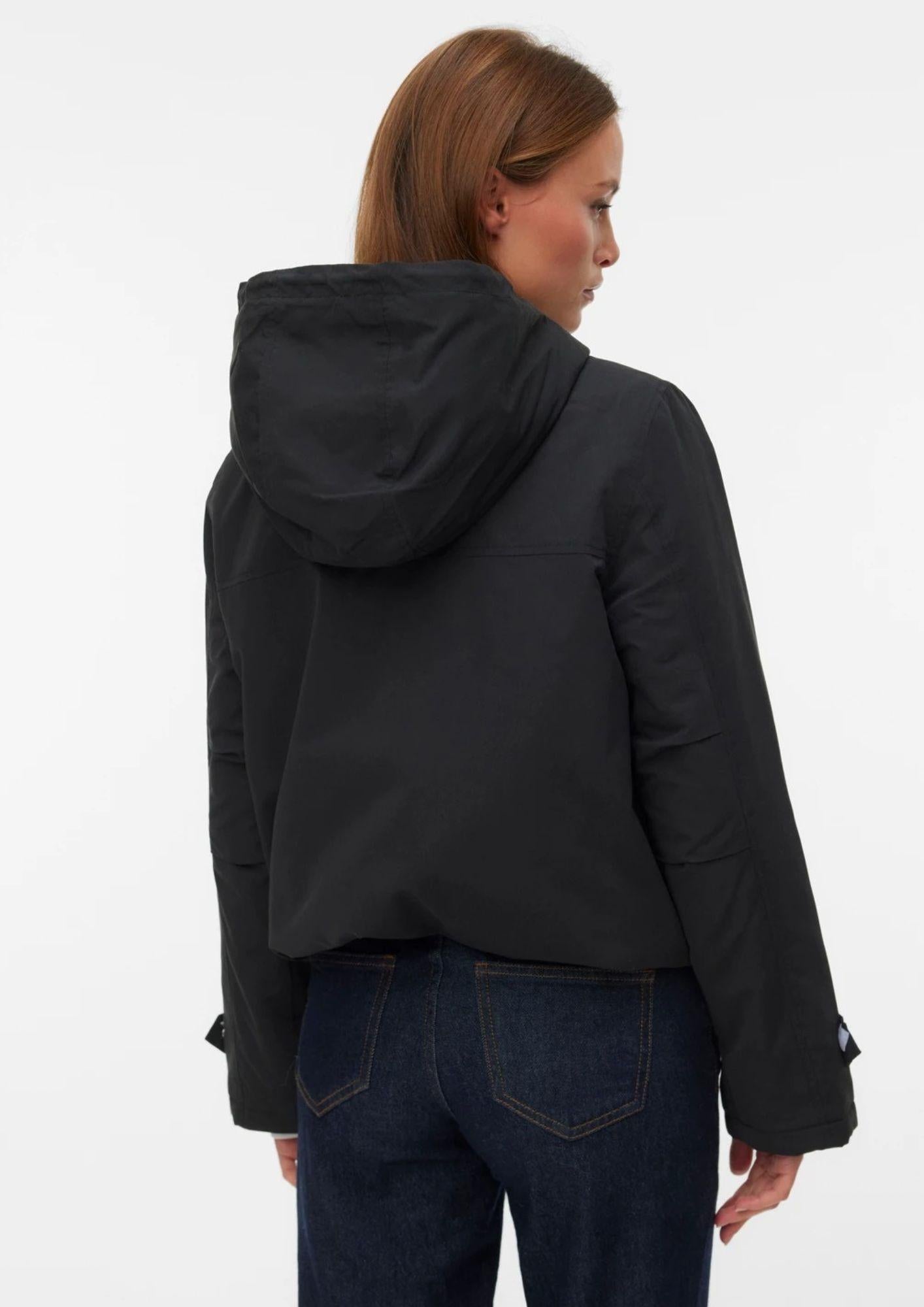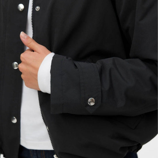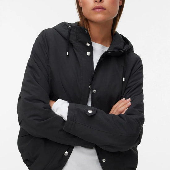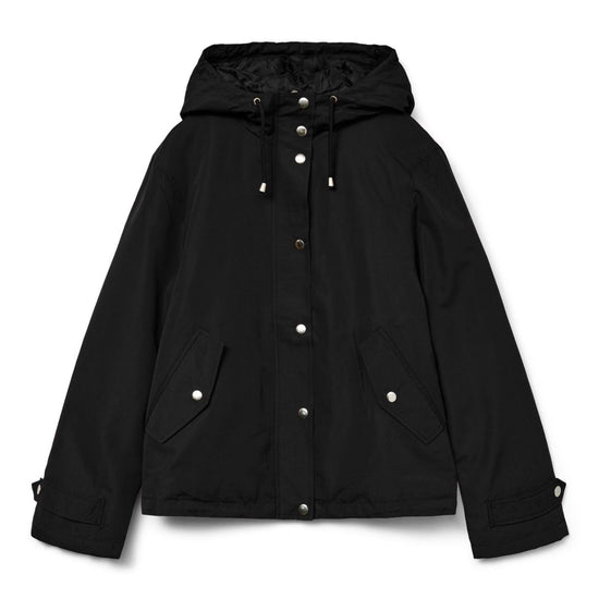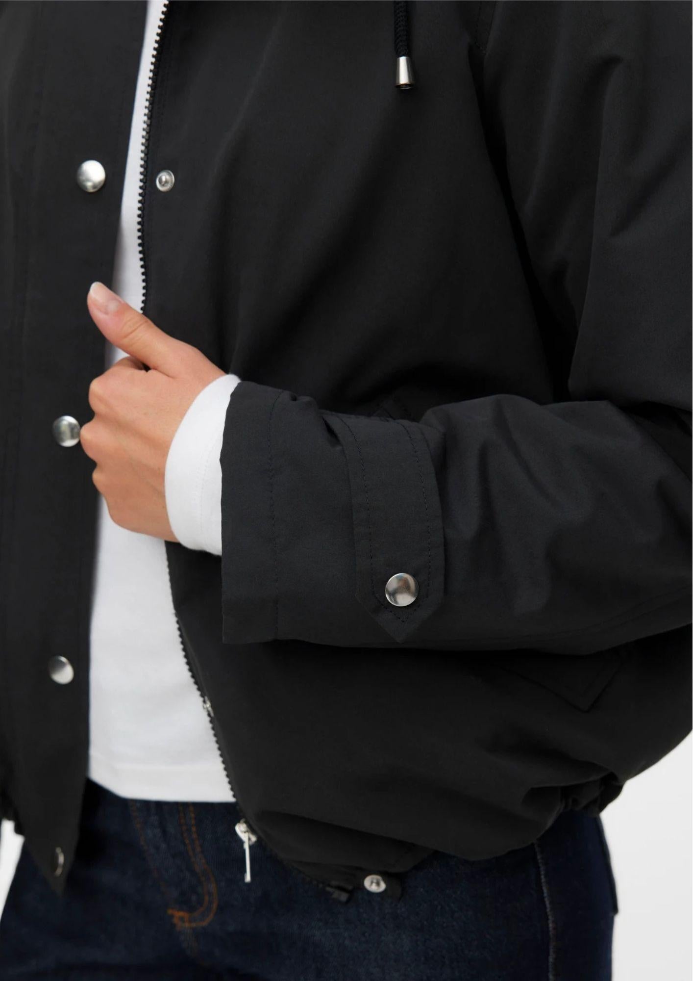 A short hooded jacket with a modern and timeless design, ideal for facing the winter season in style and comfort. Made from durable fabric and padded with recycled polyester, it guarantees warmth and sustainability. Featuring a snap closure, functional front pockets, and an adjustable drawstring for a personalized fit, it is fully lined for optimal comfort. A versatile and contemporary piece, perfect for season after season. Main fabric composition: 100% polyester, padding: 50% recycled polyester.