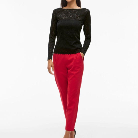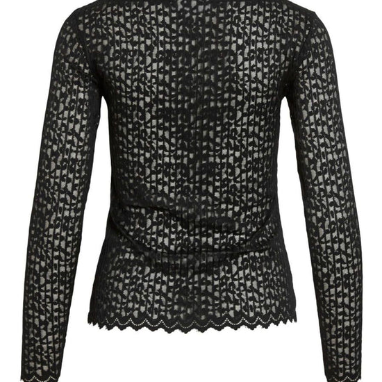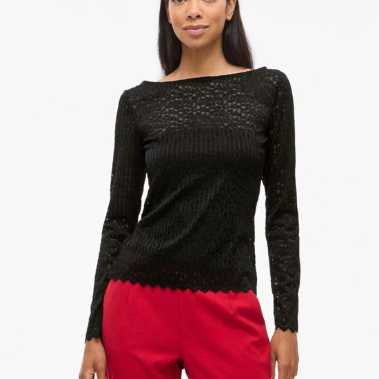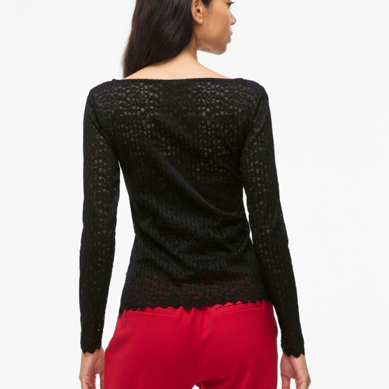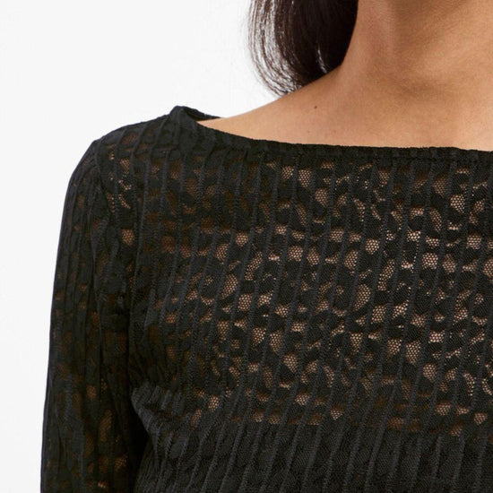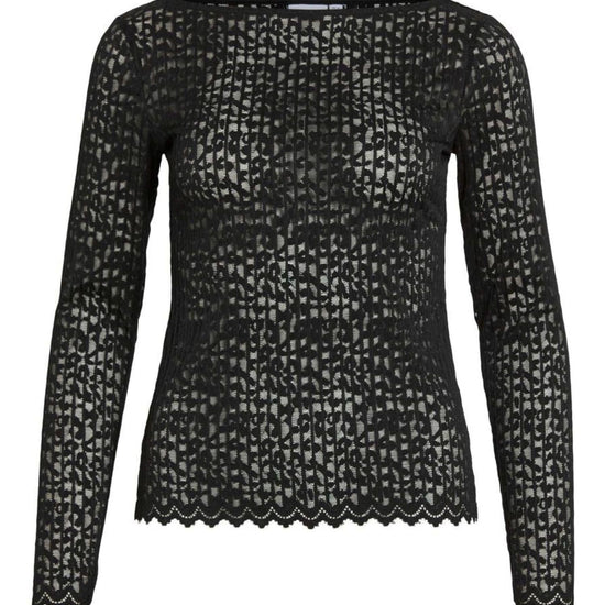 Top in pizzo a maniche lunghe, scollo a barchetta, tessuto trasparente, orlo increspato, veibilità regolare