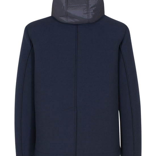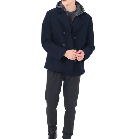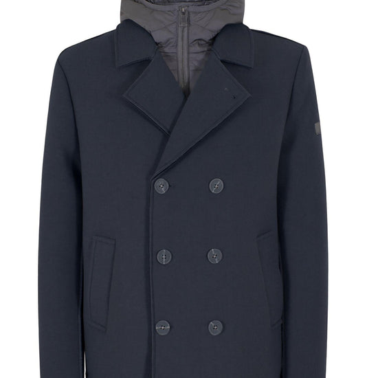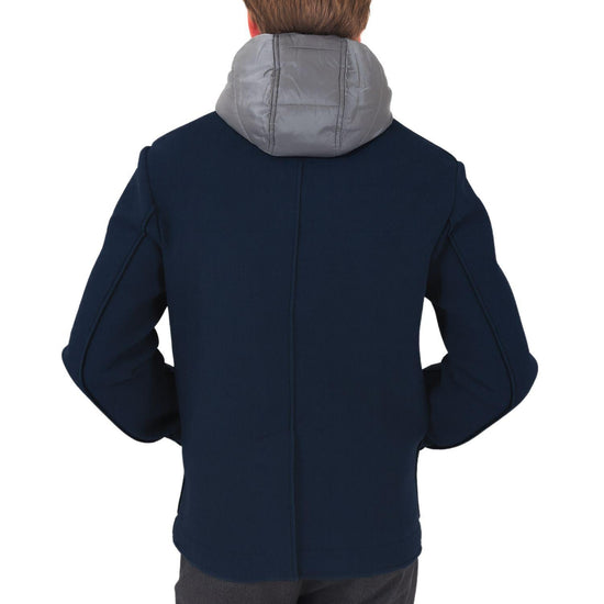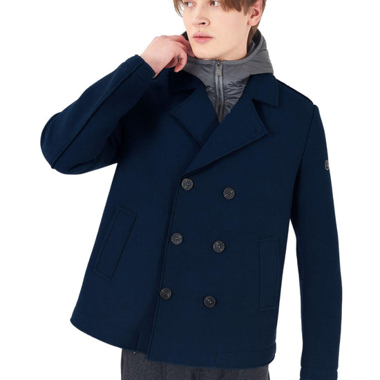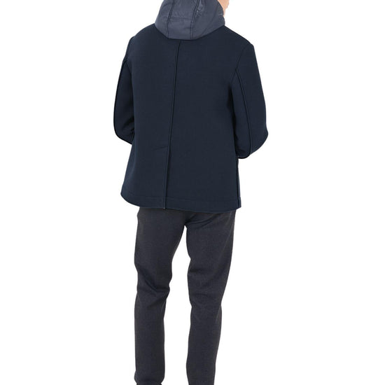 Giubbino uomo doppio petto con cappuccio, modello in panno con due tasche laterali