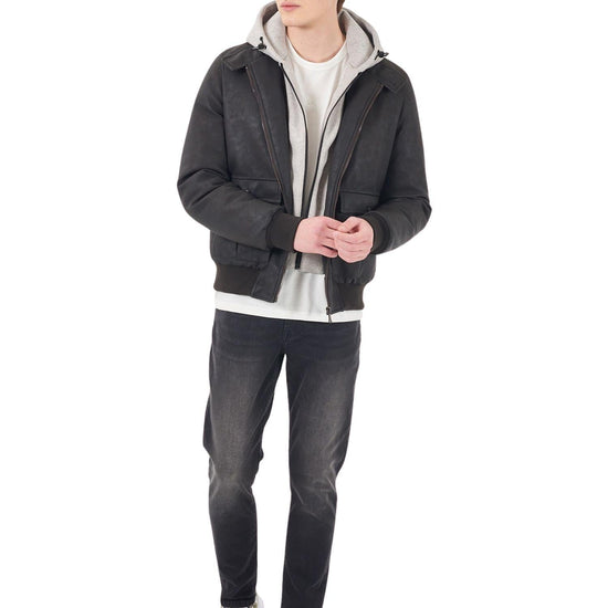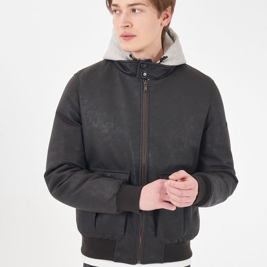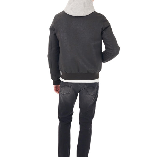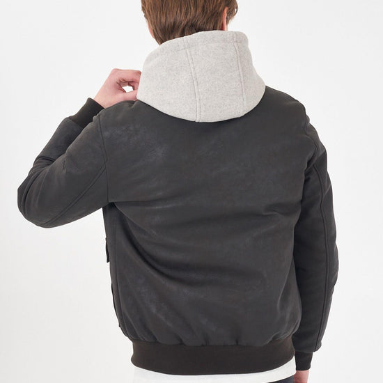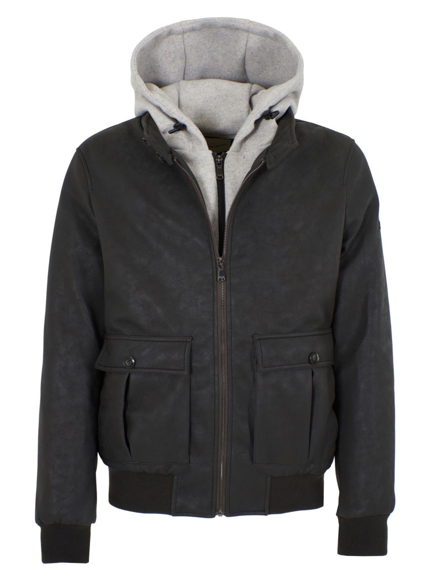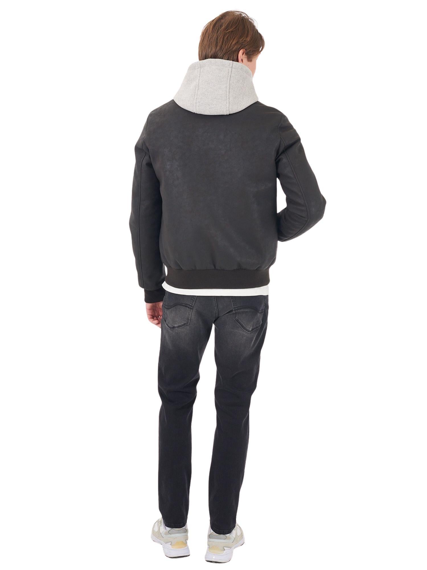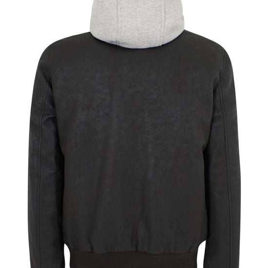 Giubbino tipo bomber con finto gilet e cappuccio, due stasche frontali. 100% Poliuretano