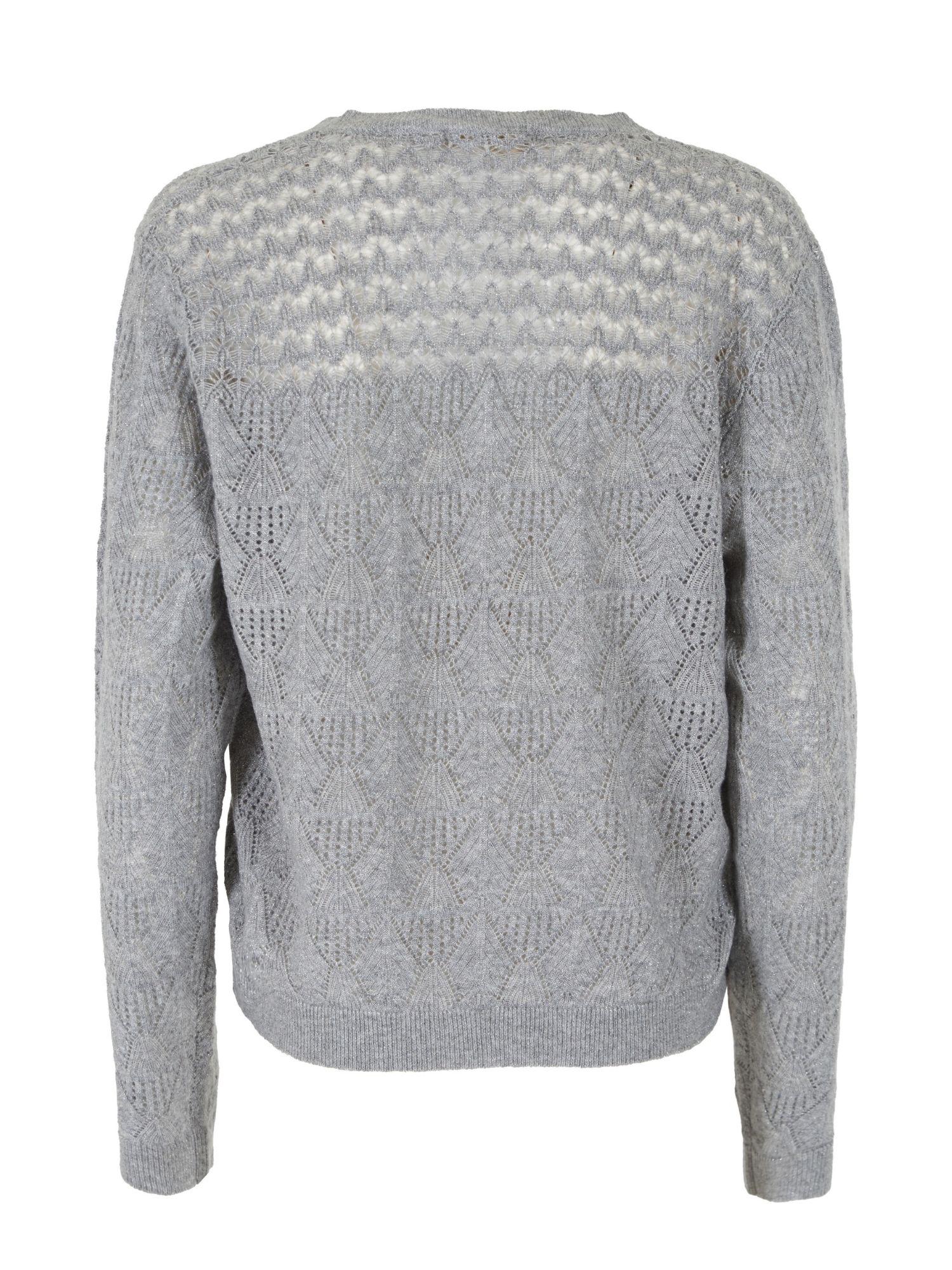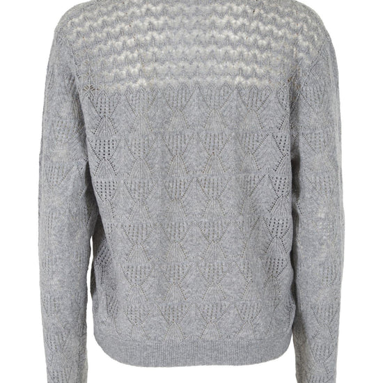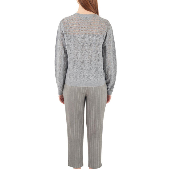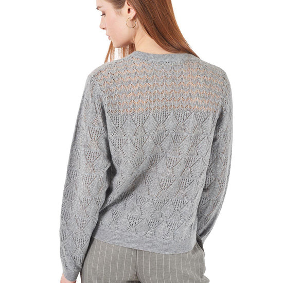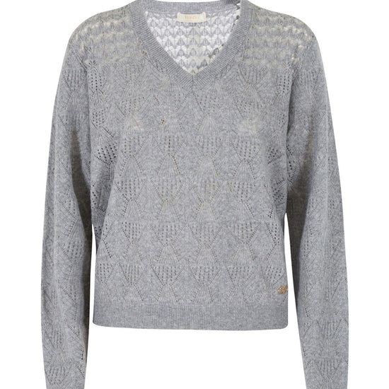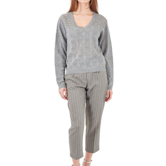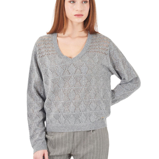 Maglia con scollo a v e motivi geometrici su tessuto, maniche lunghe, polsini e vita a coste. 50% poliestere 30% Acrilico 10% Nylon 5% Altri Filati.