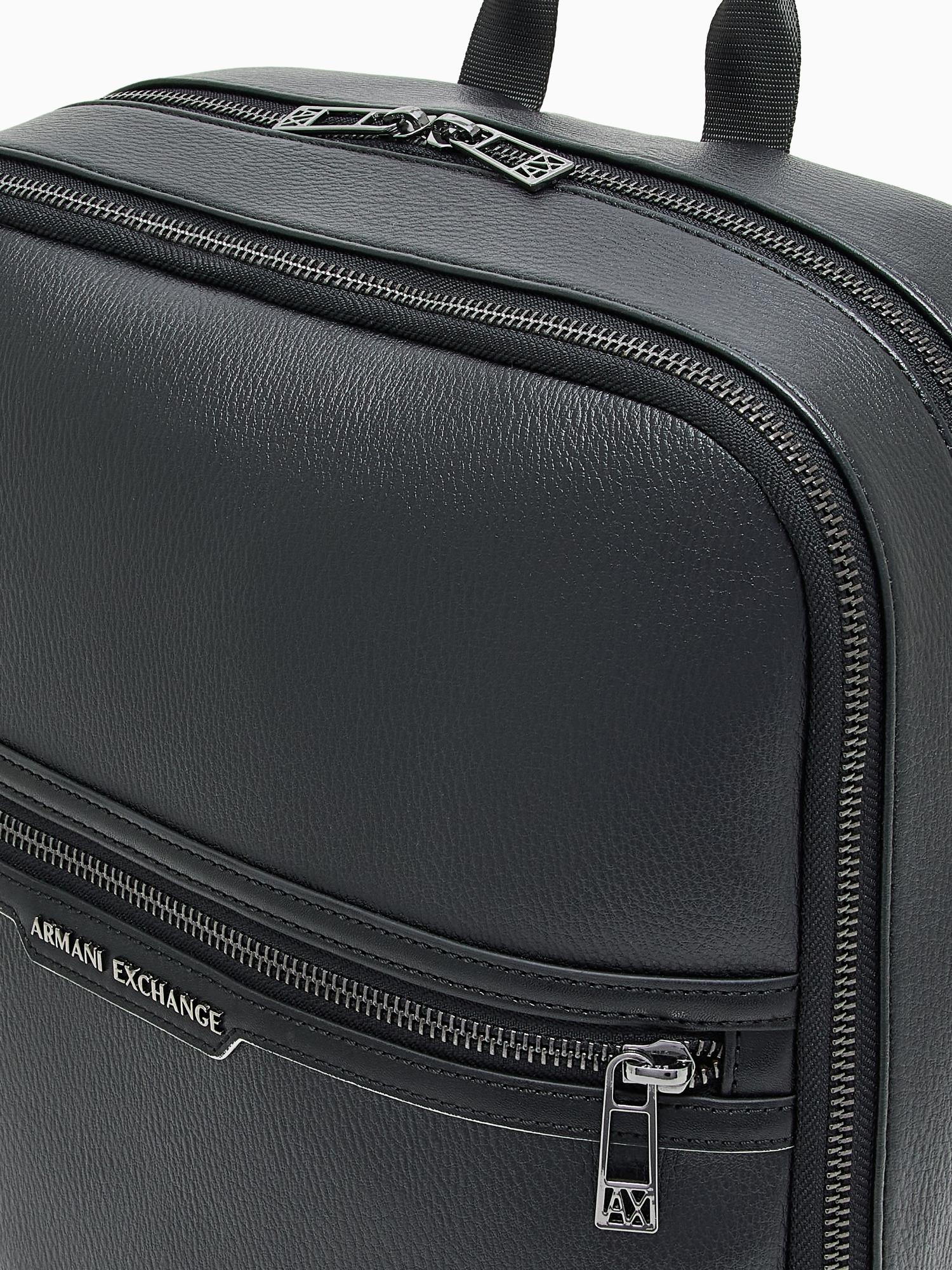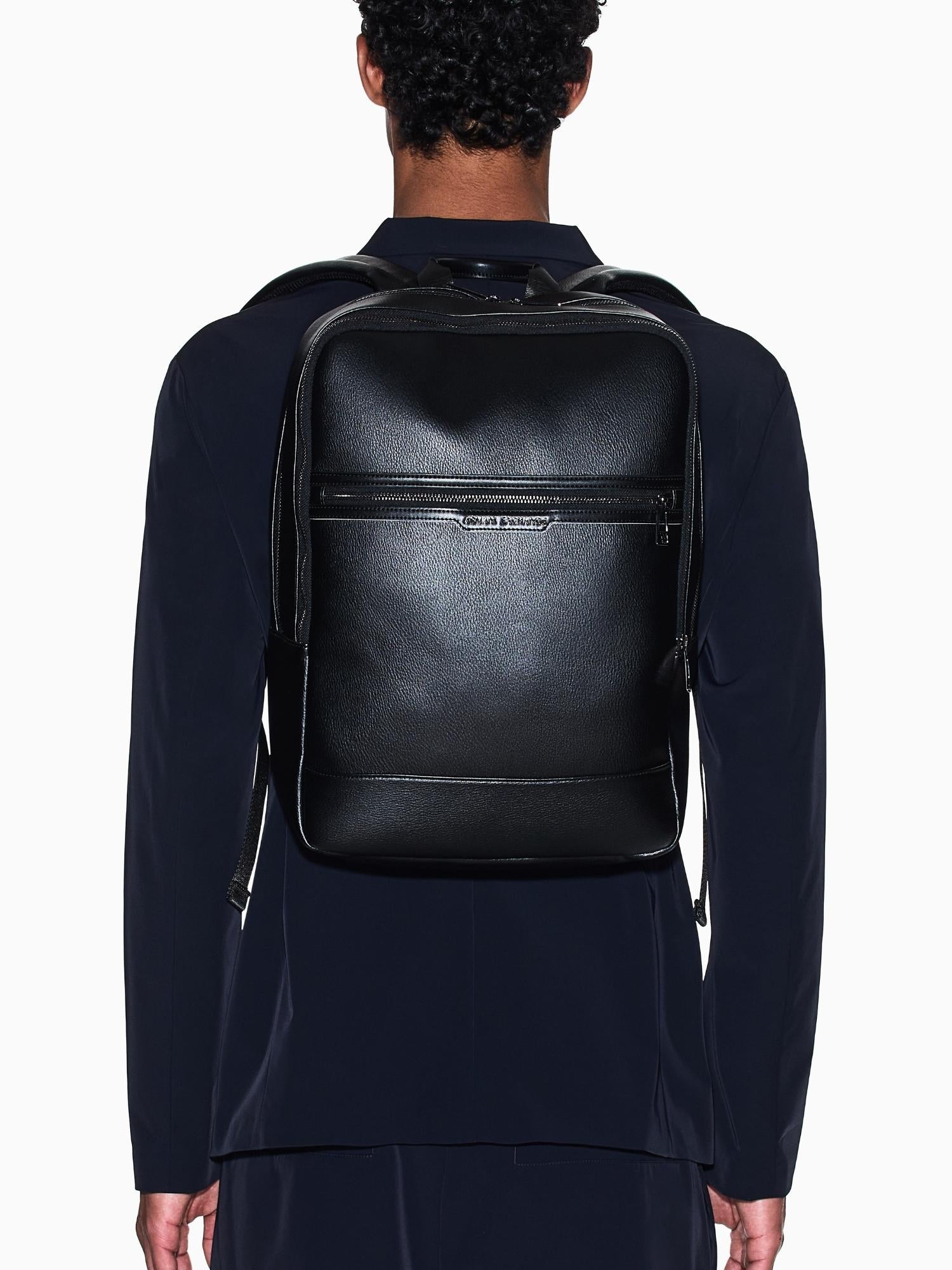 Zaino capiente in ecopelle texturizzata con tessuto principale 100% poliestere, spalmatura esterna 100% poliuretano, tessuto secondario e fodera 100% poliestere, dotato di chiusura con doppia zip, ampio scomparto principale, tasca frontale con zip, tasca laterale per bottiglia o ombrello, spallacci regolabili e imbottiti, maniglia superiore e logo frontale, perfetto per la città, luniversità o i viaggi grazie al suo design moderno, funzionale e di tendenza.