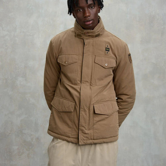 Giacca invernale ispirata allo stile militare, pratica, calda e comoda, ideale per luso quotidiano. Realizzata in cotone e nylon. Foderata in nylon trapuntato in tono. Imbottita con ovatta Sorona Aura sostenibile. Cappuccio in nylon nascosto nel colletto. Chiusura con zip e automatici. Quattro tasche frontali con automatico. Coulisse interna in vita e sul fondo. Due tasche interne con velcro. Patch e passante con logo.
