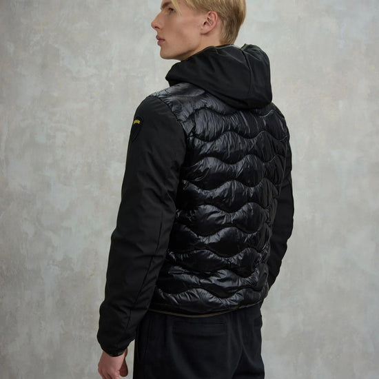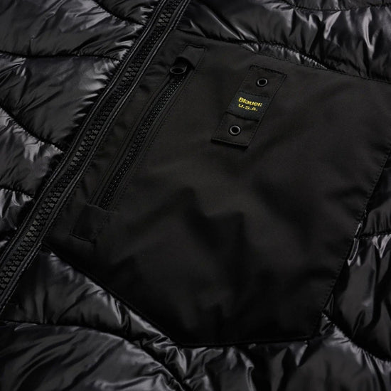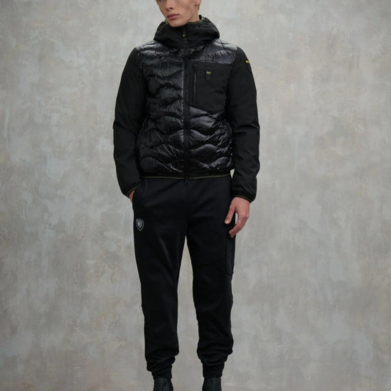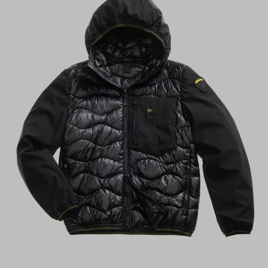 Piumino monocromatico dallo stile moderno e sportivo, caratterizzato da maniche in neoprene leggero e liscio e corpo in nylon lucido trapuntato a onde. Dotato di cappuccio fisso e fodera tono su tono, offre un perfetto equilibrio tra comfort e protezione grazie allimbottitura mista 50% poliestere e 50% piuma, che garantisce calore anche in condizioni meteo avverse. Presenta chiusura con zip e copri cursore sul collo, tasche frontali e taschino sul petto con zip, oltre a tasche interne con chiusura in velcro. Dettagli distintivi come lelastico rigato su cappuccio, polsini e fondo e il patch con logo completano il design.