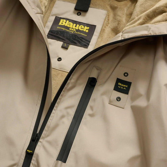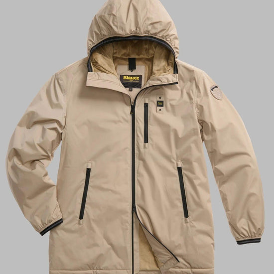 Giubbetto lungo in nylon doppio strato liscio leggero e idrorepellente con cappuccio fisso. Interno in morbida pelliccia ecologica a contrasto per calore e comfort. Cappuccio con elastico rigato sul profilo. Chiusura con zip spalmata e copri cursore sul collo. Tasche frontali con zip spalmata. Taschino con zip spalmata sul petto. Polsini con elastico rigato. Tasche interne con velcro. Patch e passante con logo.