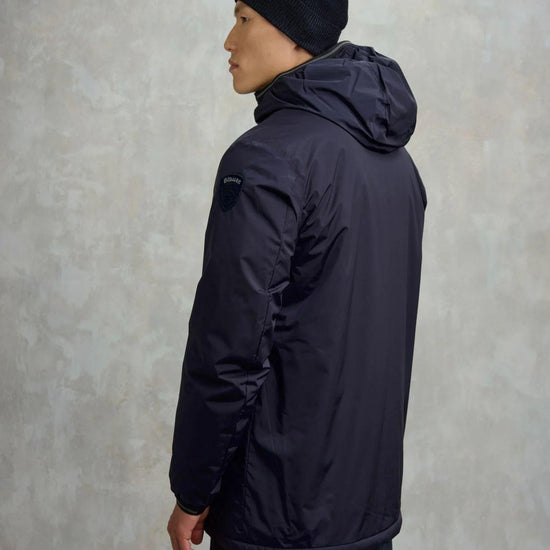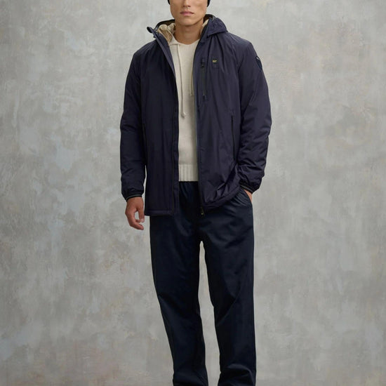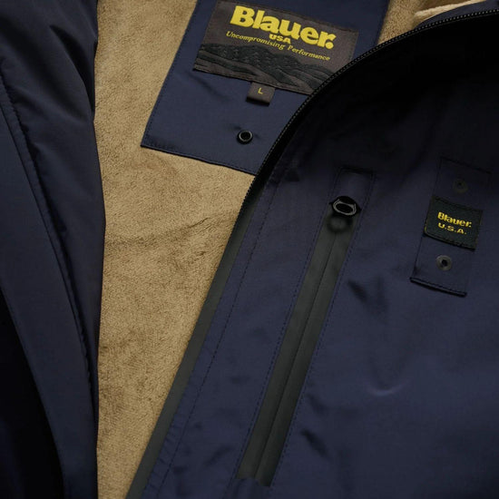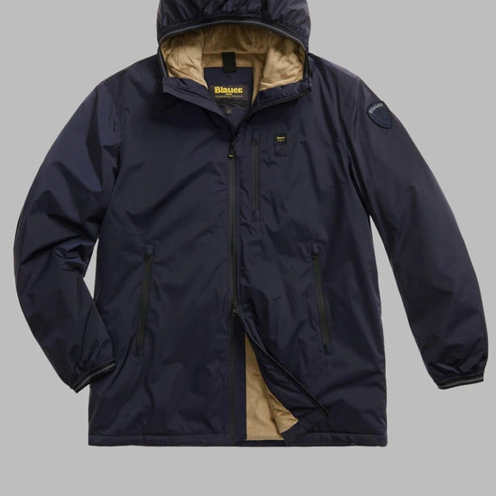 Giubbetto lungo in nylon doppio strato liscio leggero e idrorepellente con cappuccio fisso. Interno in morbida pelliccia ecologica a contrasto per calore e comfort. Cappuccio con elastico rigato sul profilo. Chiusura con zip spalmata e copri cursore sul collo. Tasche frontali con zip spalmata. Taschino con zip spalmata sul petto. Polsini con elastico rigato. Tasche interne con velcro. Patch e passante con logo.