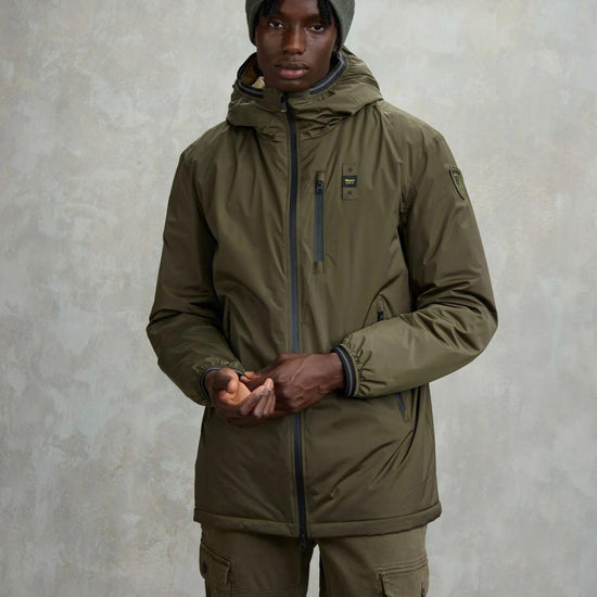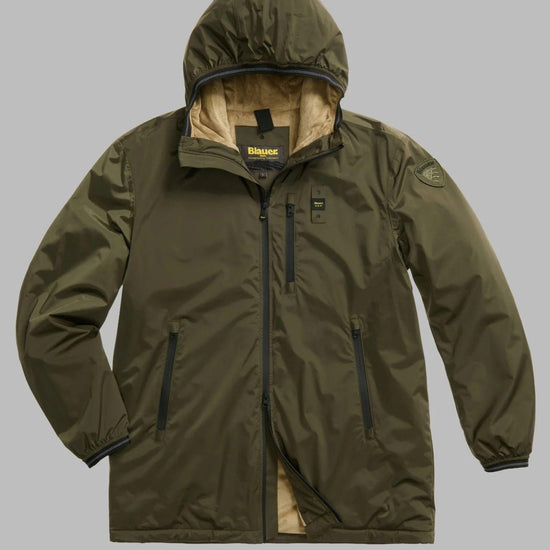 Giubbetto lungo in nylon doppio strato liscio leggero e idrorepellente con cappuccio fisso. Interno in morbida pelliccia ecologica a contrasto per calore e comfort. Cappuccio con elastico rigato sul profilo. Chiusura con zip spalmata e copri cursore sul collo. Tasche frontali con zip spalmata. Taschino con zip spalmata sul petto. Polsini con elastico rigato. Tasche interne con velcro. Patch e passante con logo.