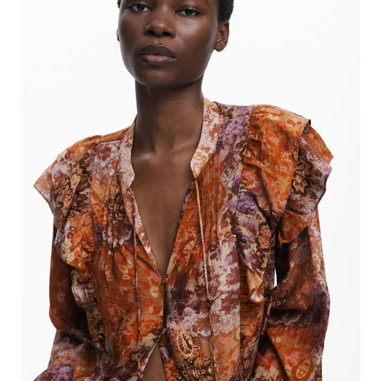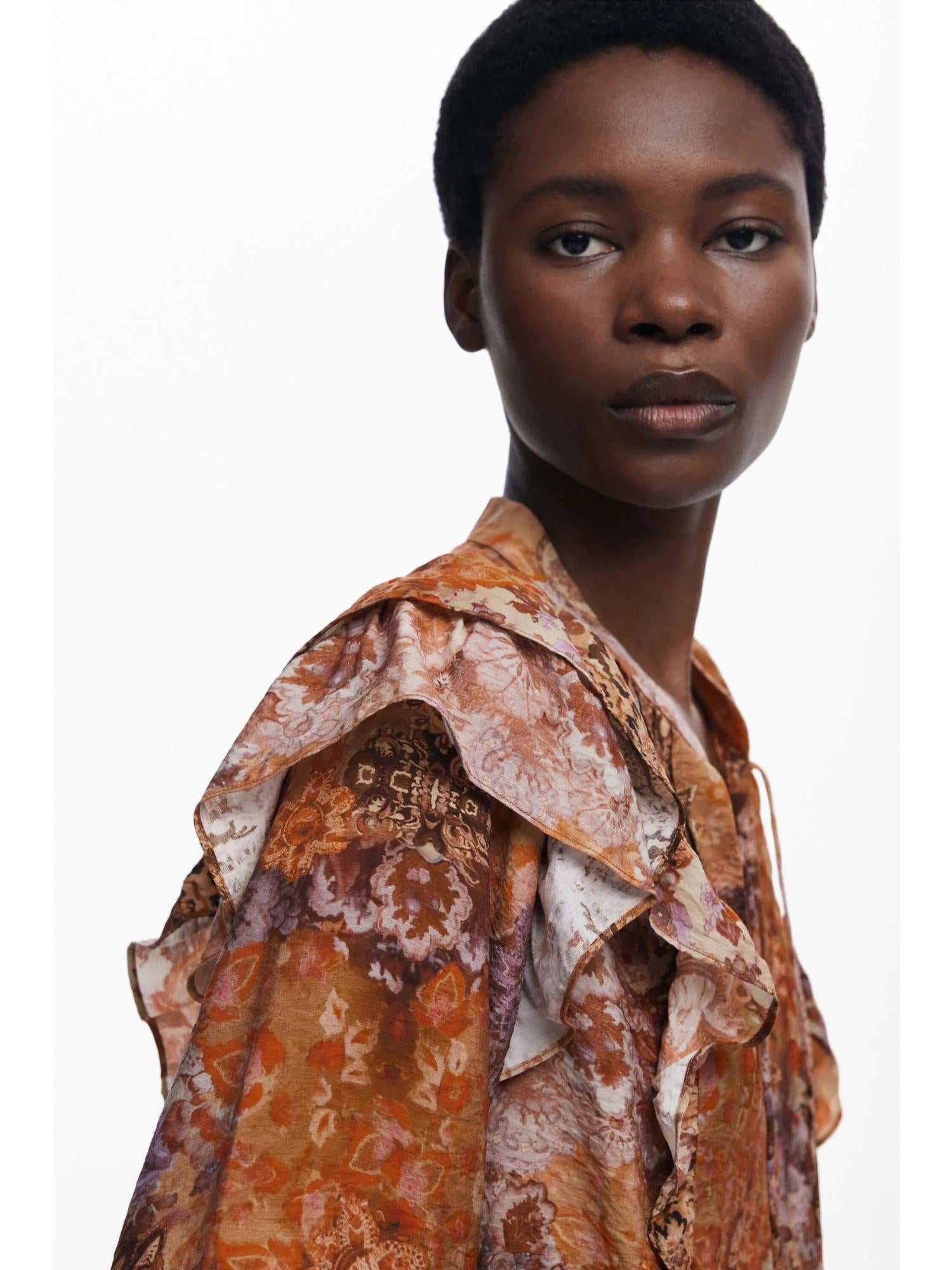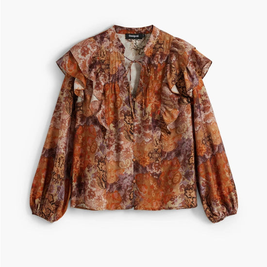 Blusa romantica a maniche lunghe con scollo a V, dettaglio di laccio e jabot, stampa paisley in tonalità aranciate. Stampa paisley. Vestibilità balloon. Collo a V. Manica lunga. Chiusura a bottoni. Dettaglio del cordoncino sul collo. Bottoni rivestiti in tessuto. Collezione AW25. Progettato a Barcellona. Realizzata in viscosa Lenzing EcoVero. Misure modello: altezza 180 cm, vita 61 cm, fianchi 89 cm. Taglia modello: S. Composizione esterna: 85% viscosa, 15% poliammide.