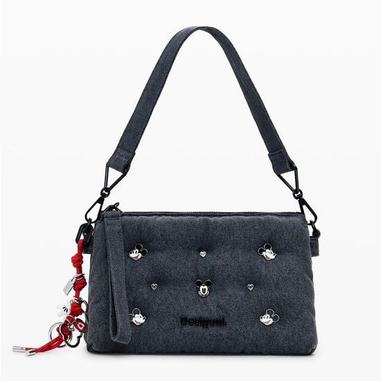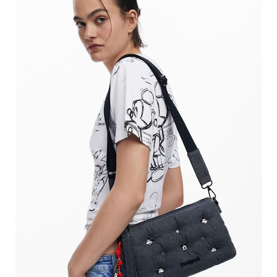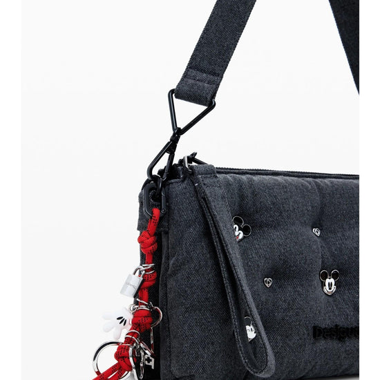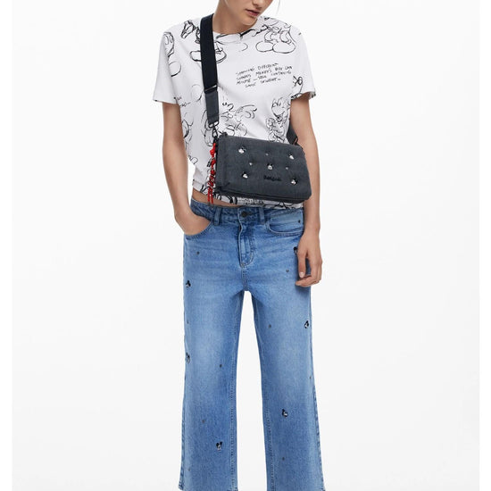 Borsa a tracolla in tessuto denim, con effetto trapuntato, dettaglio di borchie a forma di Mickey Mouse, manici intercambiabili e dettaglio di portachiavi rimovibile. Colore: Tinta unita. Stile: Tracolla. Tasca posteriore esterna. Chiusura: con cerniera. Vari scomparti interni. Tasca interna. Due manici intercambiabili. Portachiavi rimovibile. Dettaglio di borchie metalliche con volto di Mickey Mouse. Dettaglio del logo in applicazione metallica. Progettato a Barcellona. Licenza: Disney. Misure: 26 x 17,50 x 10 cm. BCI. Composizione esterna: 82% COTONE, 11% POLIESTERE, 7% VISCOSA. Composizione interna: 100% COTONE. Trimming fabric Material: 100% COTONE.