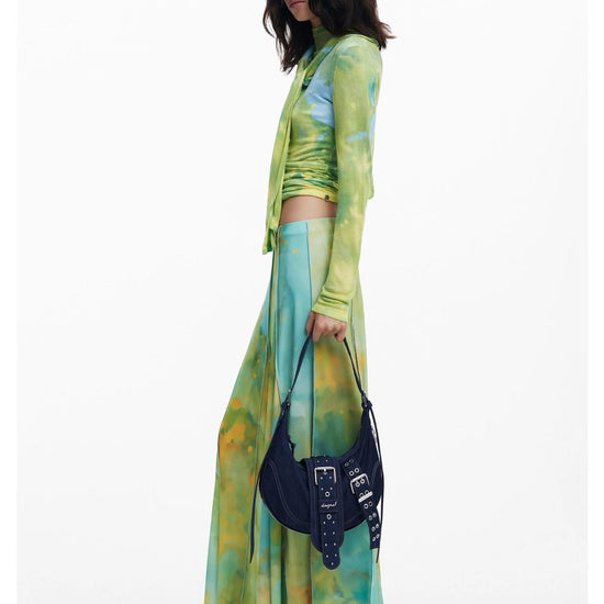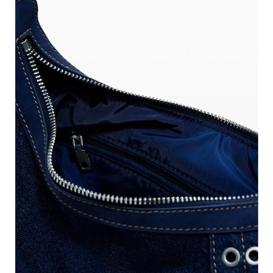 Borsa a spalla di medie dimensioni, in tessuto denim scuro, con forma ovale, grandi fibbie decorative e cuciture a contrasto stile vintage. Colore: Tinta unita. Tasca interna con cerniera. Chiusura: con cerniera. Manico regolabile. Fibbia decorative. Impunture a contrasto. Collezione AW25. Progettato a Barcellona. Misure: 32,20 x 19,20 x 8 cm. Composizione esterna: 49% COTONE, 40% POLIURETANO, 7% POLIAMMIDE, 4% POLIESTERE. Composizione interna: 100% POLIESTERE. Trimming fabric Material: 100% POLIURETANO.