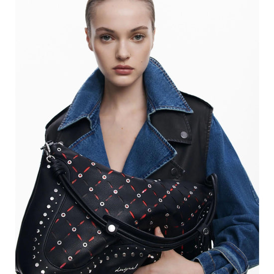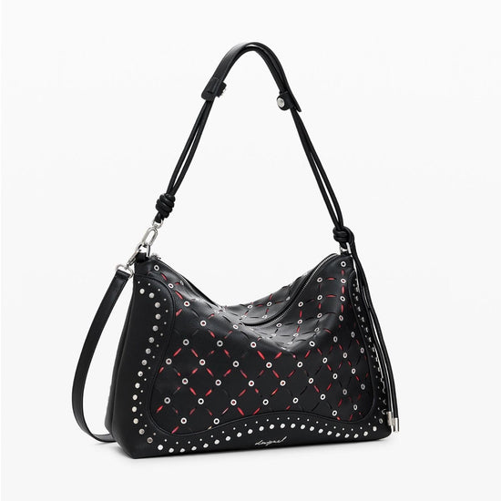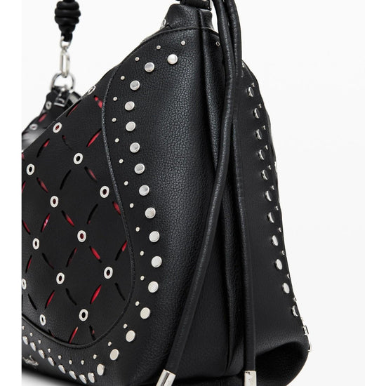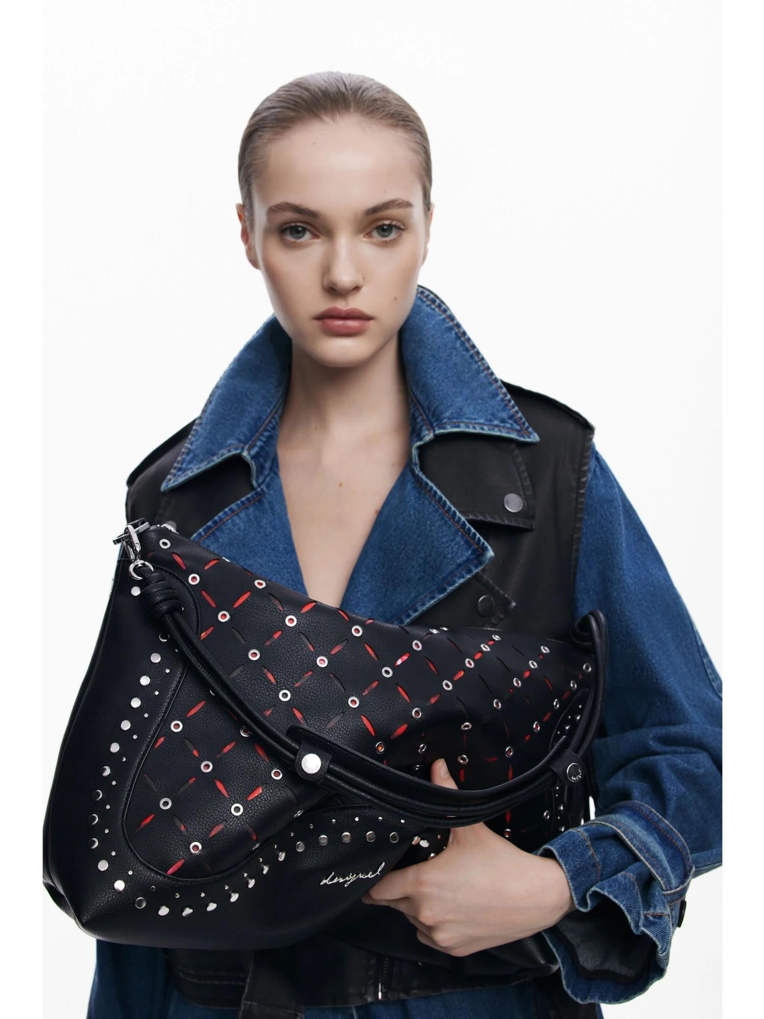 Borsa a spalla di medie dimensioni, in tessuto effetto pelle, con trafori, fodera stampata con motivi floreali e chiusura con cerniera. Tasca posteriore esterna. Tasca interna con cerniera. Chiusura: con cerniera. Manici intercambiabili. Tessuto traforato. Dettaglio del logo in applicazione metallica. Dettaglio di borchie metalliche. Effetto pelle. Progettato a Barcellona. Misure: 40 x 12,60 x 27 cm. Composizione esterna: 100% POLIURETANO. Composizione interna: 100% POLIESTERE. Trimming fabric Material: 100% POLIURETANO.
