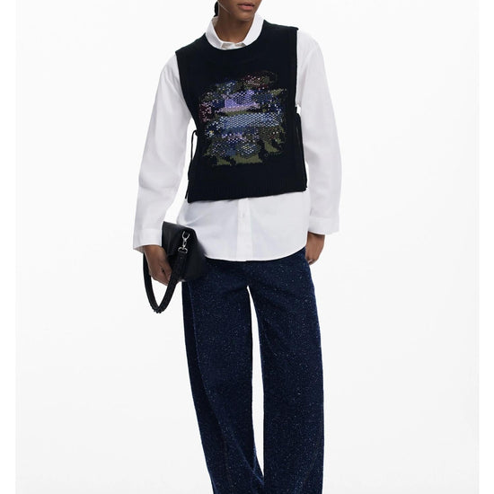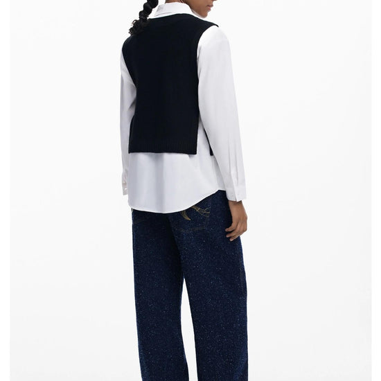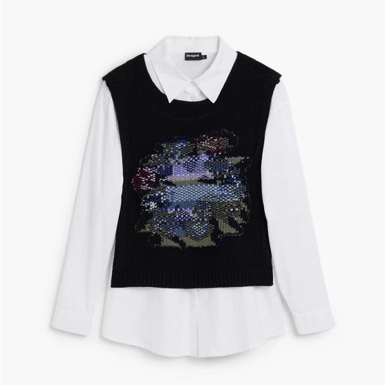 Camicia semplice a maniche lunghe 2 in 1 con gilet in maglia rimovibile, dettagli di fiocchi sui lati e stampa floreale a corona di fiori. Stampa floreale. Fit regular. Colletto a camicia. Manica lunga. Chiusura frontale. Multiposizione. Gilet rimovibile. Dettaglio di fiocchi sui lati. Progettato a Barcellona. Acquistando prodotti in cotone di Desigual, sostieni linvestimento in Better Cotton. Questo prodotto è ottenuto tramite un sistema di bilancio di massa e potrebbe non contenere Better Cotton. bettercotton.org/massbalance. Misure modello: altezza 178 cm, vita 59 cm, fianchi 86 cm. Taglia modello: M. Composizione esterna: 100% cotone.