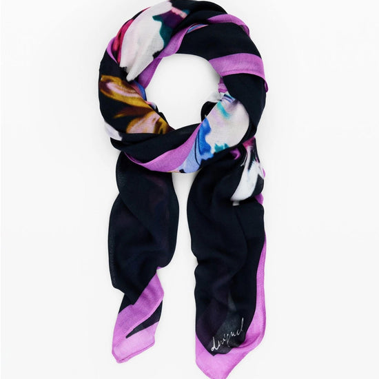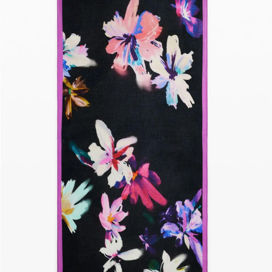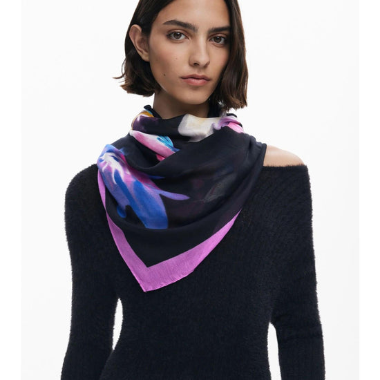 Grande foulard rettangolare, al tatto morbido con stampa floreale in colori vivaci su sfondo nero. Stampa floreale. Rettangolare. Scomparto interno. Collezione AW25. Progettato a Barcellona. Misure: 80 x 180 cm. Composizione esterna: 100% VISCOSA.