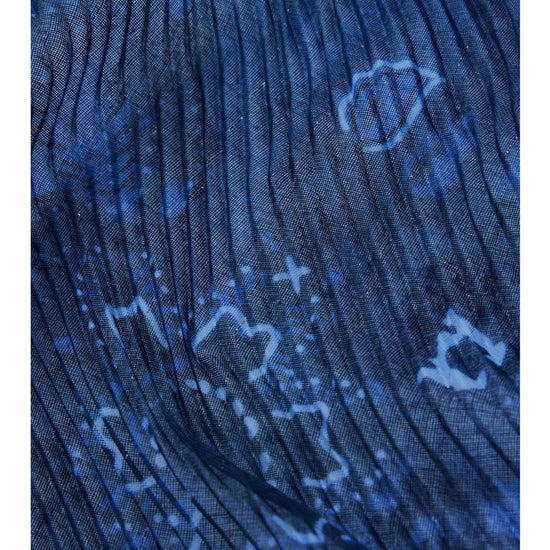 Grande foulard rettangolare in tessuto plissettato con stampa paisley in tonalità blu. Stampa paisley. Tessuto plissettato. Collezione AW25. Progettato a Barcellona. Misure: 80 x 180 cm. Composizione esterna: 99% Poliestere, 1% Fibra Metallizzata.