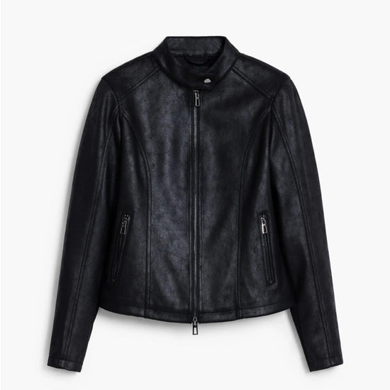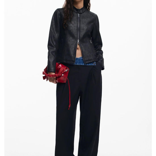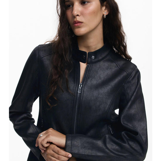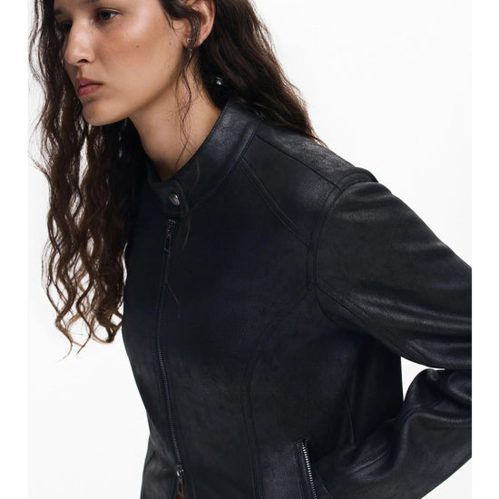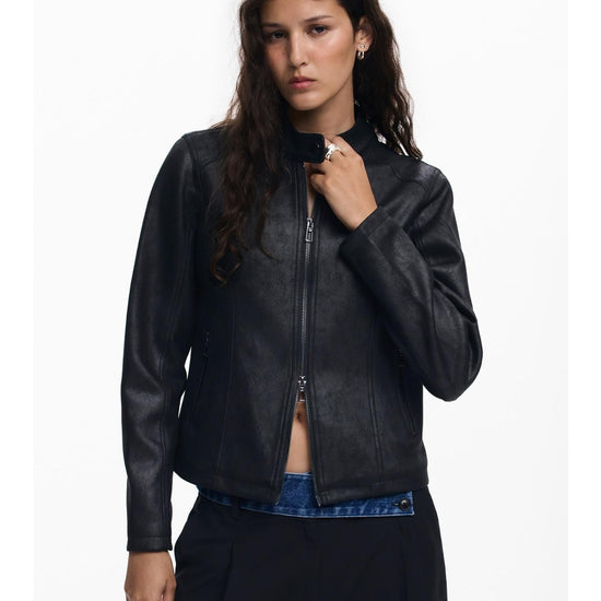 Giacca corta da donna effetto pelle dal design moderno e minimal, caratterizzata da collo alla coreana, chiusura con cerniera frontale e pratiche tasche anteriori. Le maniche combinate in tessuto a maglia aggiungono un tocco di originalità e comfort, rendendola perfetta per un look urbano e contemporaneo. Realizzata con materiali sostenibili in poliestere riciclato, fa parte della collezione Autunno/Inverno 2025, progettata a Barcellona. Fit regolare, ideale per outfit casual o più ricercati. Composizione esterna: 96% poliestere, 4% elastan. Fodera interna: 100% poliestere riciclato.