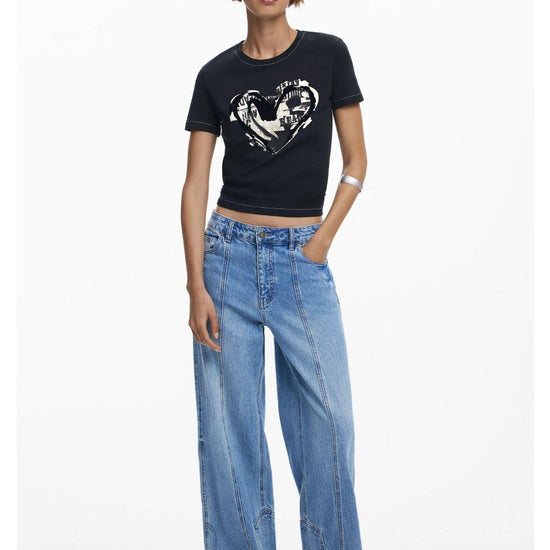 Maglietta a maniche corte con collo rotondo e cuore in velluto con stampa di giornale allinterno. Stampa arty. Fit regular. Collo rotondo. Manica corta. Dettaglio floccato. Realizzato con materiali sostenibili. Collezione AW25. Progettato a Barcellona. Misure modello: altezza 180 cm, vita 62 cm, fianchi 90 cm. Taglia modello: S. Composizione esterna: 95% cotone, 5% elastan.