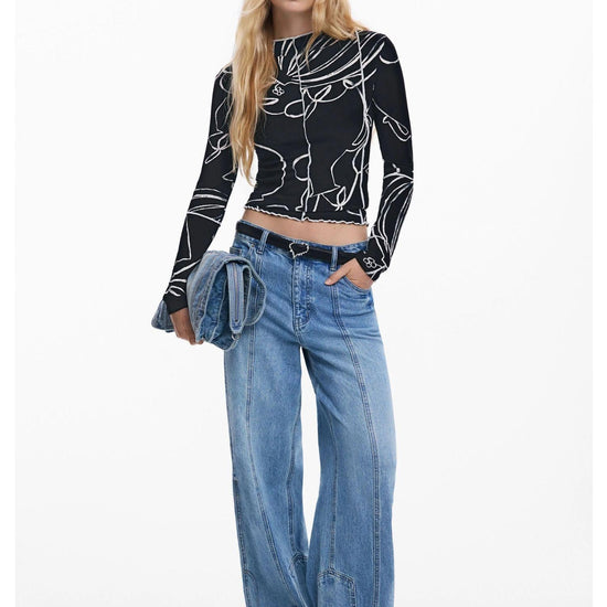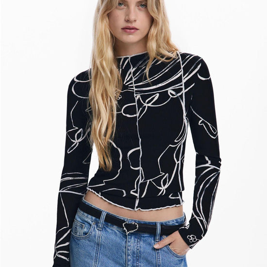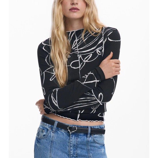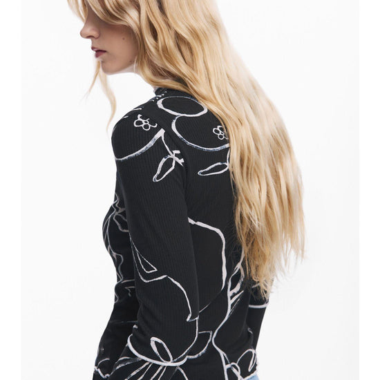Maglietta a costine a maniche lunghe con collo leggermente alto, cuciture a contrasto e stampa di silhouette di fiori e vasi. Stampa arty. Fit regular. Collo dolcevita. Manica lunga. Finiture a costine. Cucitura frontale visibile. Collezione AW25. Progettato a Barcellona. Tessuto in viscosa Lenzing EcoVero. Misure modello: altezza 180 cm, vita 64 cm, fianchi 90 cm. Taglia modello: S. Composizione esterna: 94% viscosa, 6% elastan.