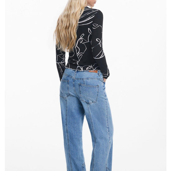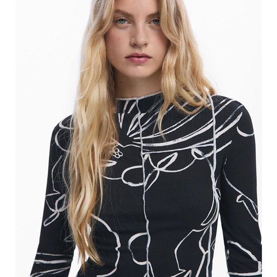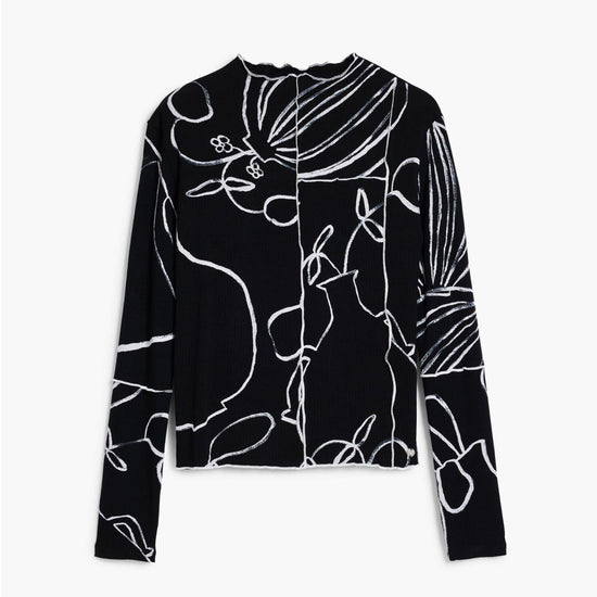 Maglietta a costine a maniche lunghe con collo leggermente alto, cuciture a contrasto e stampa di silhouette di fiori e vasi. Stampa arty. Fit regular. Collo dolcevita. Manica lunga. Finiture a costine. Cucitura frontale visibile. Collezione AW25. Progettato a Barcellona. Tessuto in viscosa Lenzing EcoVero. Misure modello: altezza 180 cm, vita 64 cm, fianchi 90 cm. Taglia modello: S. Composizione esterna: 94% viscosa, 6% elastan.